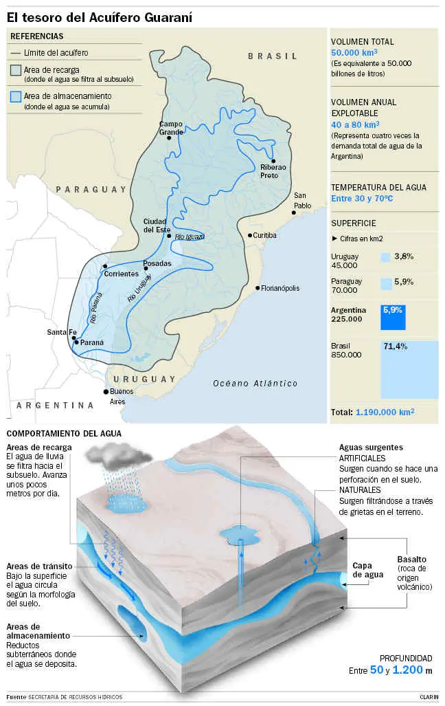 El Acuífero Guaraní es el segundo reservorio de agua más importante del mundo y el primero del continente americano. La cantidad de agua que almacena es suficiente para abastecer a toda la población del mundo durante doscientos años. Pero, ¿este recurso está siendo verdaderamente cuidado y protegido? ¿Paraguay, Brasil, Uruguay y la Argentina son conscientes del valor estratégico que tienen? ¿Entendemos su verdadera importancia? ¿Se lo está contaminando? ¿Es probable que las grandes potencias del mundo vengan por el agua? Observador Global desarrolló una investigación sobre un recurso que será centro de atención mundial en los próximos años: El Acuífero Guaraní. Agua. Sólo agua. Una sustancia tan esencial para la vida como el aire. Agua por todas partes, agua que no debería tener sabor, olor, ni color, permite que la vida exista. Pero el agua no será eterna. El agua es un recurso que debe ser cuidado. Hace unos años que se escucha en los medios de comunicación que las próximas guerras serán por el agua. Suena raro, lejano, a ciencia ficción. ¿El agua será el próximo botín de guerra? Frente a esta realidad existen cuatro países que poseen un tesoro escondido bajo tierra llamado Acuífero Guaraní. Esta enorme cantidad de agua se presenta como un inabarcable tanque de almacenamiento que podría abastecer a la población mundial durante doscientos años. El hidrólogo paraguayo Elías Díaz Peña describe que “el acuífero es muy grande, tiene aproximadamente un millón doscientos mil kilómetros cuadrados. Se puede decir que cubre prácticamente la mitad Este de la Cuenca del Plata”. El agua subterránea del Sistema Guaraní se aloja en formaciones geológicas antiguas, correspondientes a los períodos Triásico, Jurásico y Cretácico Inferior, teniendo esas rocas edades entre los 132 y los 200 millones de años. “Estas rocas sedimentarias porosas que reciben agua del acuífero y que conforman el acuífero son un complejo de areniscas que fueron formadas hace más de 200 millones de años cuando los continentes de la Tierra estaban todavía todos juntos en lo que los geógrafos llaman hoy Pangea”, detalla Díaz Peña. Brasil, Paraguay, Uruguay y la Argentina tienen el privilegio de compartir este recurso. Un sistema tan perfecto que en diferentes zonas permite la entrada y salida de agua bajo el nombre de áreas de recarga. “Las áreas de recarga, que también se reparten en esos cuatro países, son un poco más del 10_ del total. Son aproximadamente 150.000 kilómetros”, confirma Díaz Peña. Pero a pesar de ser el reservorio de agua potable más grande de América, su cuidado y las condiciones de recarga y descarga del sistema son casi desconocidas por su población. “El Paraguay, en ese sentido, cumple un rol preponderante en la conservación y en la salud del agua del Acuífero porque una porción importante de las áreas de recarga están en territorio paraguayo” aclara el Ministro del Ambiente de Paraguay, Oscar Rivas. Cuando la zona de recarga se destruye, en primer lugar disminuye y se cambia el uso del suelo. Por ejemplo, el reemplazo de selvas por sojales. Esto en primer lugar disminuye radicalmente la cantidad de agua que entra al acuífero y en segundo, puede producir una gran contaminación por efectos de los tóxicos que se utilizan tanto en la agricultura como en la industria. UN RECURSO ESTRATÉGICO Casi todos los científicos coinciden en que, con el paso del tiempo, cada vez será más complicado obtener agua potable. Frente a esta realidad, el agua almacenada en el Acuífero Guaraní se está convirtiendo en un recurso cada vez más valioso. “Desde las Naciones Unidas se está afirmando cada vez más que los recursos hídricos que realmente importan en este momento son los subterráneos por sobre los recursos hídricos superficiales” advierte la geopolítica y estudiosa del tema, Elsa Bruzzone. Pero a pesar de todas las advertencias de los científicos y expertos, los cuatro países que comparten el Acuífero Guaraní tardaron seis años hasta formar una comisión para estudiarlo y preservarlo. Al hacerlo, el rol de las instituciones privadas extranjeras que financiaron los trabajos fue determinante. Este aporte fue visto por algunos como algo fundamental. Otros lo consideraron una intromisión con intereses ocultos. “Fue un proyecto que se llevó a cabo con fondos del Banco Mundial, la OEA, GEF (Global Environment Facilities) y otros patrocinadores y mediante contratos y demás se trabajó con investigadores. De ahí es donde quedaron muchas dudas, se encontraron dudas todavía, muchas cosas por trabajar” profundiza la geóloga de la UBA, Griselda Galindo. “Afortunadamente, el 30 de enero de 2009 el Banco Mundial dio por finalizado el proyecto. Muy bien que el Banco Mundial se haya retirado, pero se ha llevado todo el conocimiento estratégico” denuncia Bruzzone. INCOLORA INVASIÓN Hace años que el ejército de los Estados Unidos plantea la hipótesis de la existencia de terroristas en la Triple Frontera, una situación que les permitiría instalar bases de combate, sospechosamente cercas a las zonas de recargas de Acuífero. Con el paso del tiempo y la imposibilidad de probar la existencia de estas células, la hipótesis pasó de ser “hay grupos terroristas” a “se financian actividades terroristas”. Pero nada ha sido comprobado. El agua sigue debajo de todas estas disputas. Si hay o no grupos terroristas en la zona, si las empresas trasnacionales vienen a buscar conocimiento estratégico que usarán más adelante, si se lo está contaminando. Poco se sabe a ciencia cierta. “El norte desarrollado mantiene su estilo de vida insustentable gracias a la exportación de bienes naturales del sur hacia el norte. Y esto es un peligro para la soberanía de los pueblos del sur”, describe el Ministro de Ambiente de Paraguay, Oscar Rivas. “Cuando yo me refiero a que vienen por el agua, me refiero a que vi