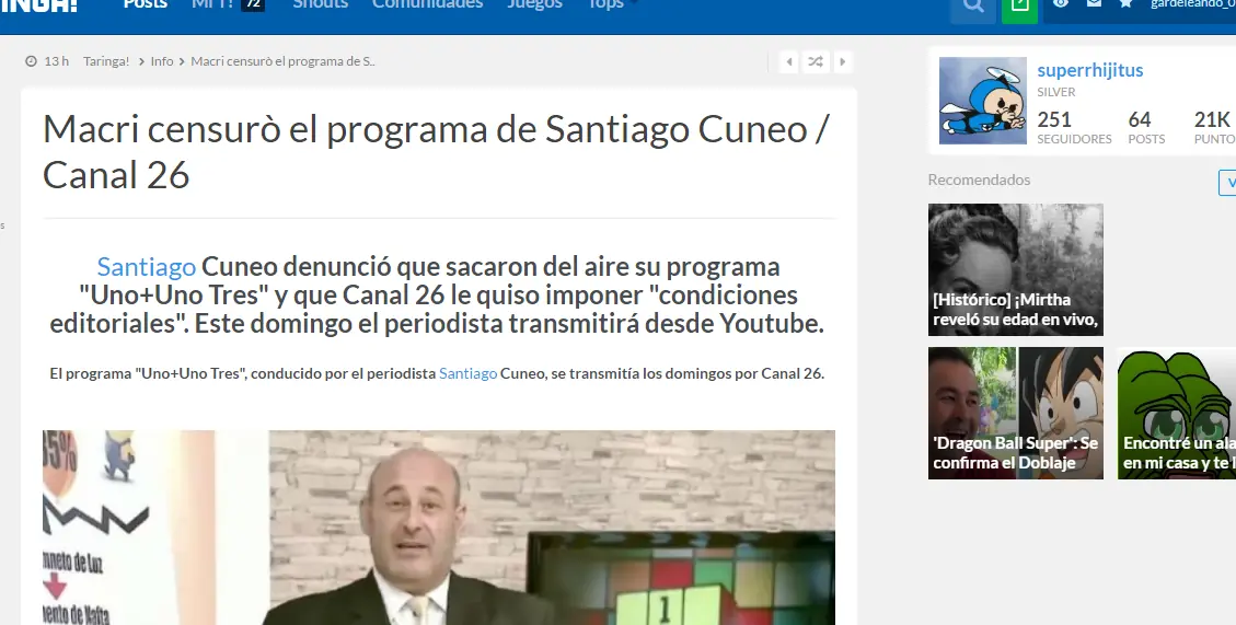 Bueno, hago este post porque los muchachos K siguen insistiendo con este tema... a un punto hartante , asqueante y sobretodo falaz y mentiroso. el post es corto: un video de unos minutos donde se explica claramente la relacion de CFK y el Padre del Presidente. ¿porque nunca le cobraron la deuda ellos a Franco Macri? ¿Porque si ella consideraba que los Macri eran lo peor de la Argentina seguia haciendo trato con ellos? ¿ Si eran 70 mil millones de pesos, porque no los cobraron nunca los K en 12 años de gobierno, acaso no nos hacian falta a los Argentinos para mejorar los hospitales, las rutas, alimentar a los niños desnutridos etc etc etc ? Fue Cristina misma quien impulso los tratados entre la ahora "diabolica" SOCMA y el gobierno Chino. ¿Aqui Nestor con Franco Macri... sera que le estaba cobrando la deuda o estaban haciendo negocios? ¿Scioli con Macri, Scioli muy enojado reclamando a Macri por ser "vende patrias" se ve claramente el enojo de Scioli con Macri no? Aqui el video... clarito y conciso. para que no queden dudas. solo 5 minutos para que dejen de ser engañados por los que mienten y mienten usando la consigna de " miente y miente que algo queda". pero no hay que dejarse mentir. ellos buscan formar tu opinion bombardeandote con mentiras constantemente. link: https://www.youtube.com/watch?v=pYz_3y4YQic&feature=youtu.be Yapa link: https://www.youtube.com/watch?v=4A1eHAonIE4 Yapa 2 audio de Baby sobre el tema. http://radiocut.fm/audiocut/el-angel-del-mediodia-sobre-la-supuesta-deuda-de-los-70-mil-millones/