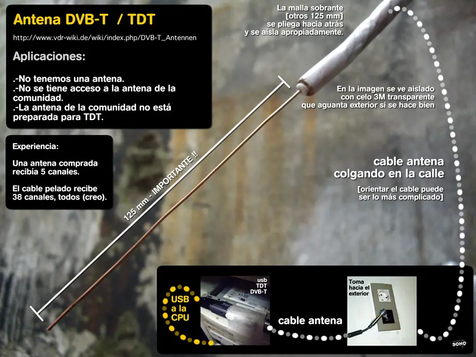 Para todos aquellos que posean un TV LCD o LED con sintonizador TDT (TDA - DTV, etc) incluído y quieran agarrar los canales que ofrece la televisión digital terrestre (gratuita) sin gastar $500 en una antena. Es muy simple, toman el cable coaxil y lo pelan sacando el plástico negro desde la punta unos 25 cm. A los primeros 12,5 cm lo vuelven a pelar dejando sólo el alambre de cobre grueso del medio, lo más recto posible. Y a los otros 12,5 cm lo dejan mallado o con el papel aluminio que viene en algunos cables.A este "dispositivo" lo apuntan hacia el sitio desde donde provenga la señal (en Rosario hay que apuntarlo al sur). Por increíble que les parezca, funciona 100%. Para los futboleros, tienen todos los partidos de la TV pública en HD... Es increíble que sea tan pero tan fácil y simple... Si lo hacen agradezco los comentarios, por acá anduvo perfecto! les aseguro que funciona perfecto, capte 17 canales a una altura baja , luego la subire al techo para captar mas vivo en san miguel de tucuman pzta mitre, se ve mejor que mi cable de mierda (supercanal) NO LE HAGAN CASO A LO DE USB(la imagen es ilustrativa) Aca el resultado (en mi tv , es un LED 40" aca la antena trucha que me mande (la puse por el techo agujereado que tengo en el patio jaja) (por si preguntan ya estaba aujereado , no lo adujere para la antena) grilla de canales (2013) COMENTEN COMO LES FUE, ANIMENSE QUE ES MUUUUUUUUY FACIL