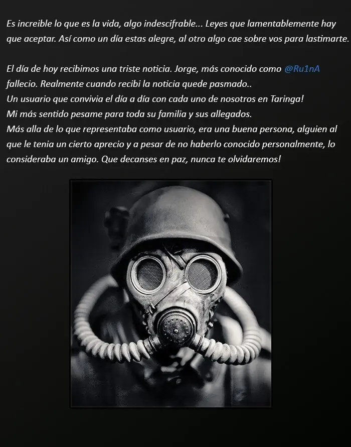 Ru1nA este es solo un pequeño homenaje, gracias a vos mi pc pudo seguir viva, jaja, aunque vos nunca me conociste yo si, eras uno de los pocos que no hacia crap, a nadie le interesa la opinion de un novato, ni creo que te interesara si siguieras vivo, pero vos eras y seguis siendo un capo, un maestro, y todavía no creo que te hayas muerto, aunque me ignorabas todo el tiempo, siempre te tuve afecto, gracias por estar en taringa, y ayudar a las personas, y aunque a mi nunca me contestaste a mis amigos si les contestabas y con toda la amabilidad que se podía pedir, te quiero Ru1nA, y no dejaste un vacío, porque vos seguis vivo, aca, en esta página, y en el corazon de muchos, Que descances en paz amigo :'c nos cachaste mal Esta foto es un homenaje que hizo pintias para vos :') Y esta la hice yo, no soy bueno editando, pero mi intencion es la mejor, me cuesta creer que ya no estes, pero hay que aceptarlo, te quiero hermano c':