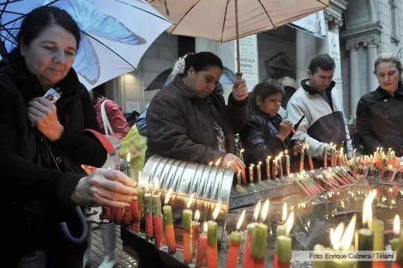 AJENOS A LA LLUVIA, DESAFIANDO A LA LLUVIA O, A DECIR VERDAD, A PESAR DE LA LLUVIA, MILES DE FIELES DE TODO EL PAÍS SE ACERCARON DESDE EL PRIMER MINUTO DEL DÍA A LA PARROQUIA NUESTRA SEÑORA DE BALVANERA, DE ESE BARRIO PORTEÑO, PARA CELEBRAR LA FIESTA GRANDE DE SAN EXPEDITO, EL SANTO DE LAS CAUSAS JUSTAS Y URGENTES. Como todos los años desde 2004, el templo ubicado en el cruce de Azcuénaga y Bartolomé Mitre se convirtió en el epicentro de la fe de miles de fieles que, en peregrinación desde distintas partes del país, a pie o en transporte público, resistieron las seis cuadras de cola -hasta avenida Rivadavia- bajo la lluvia torrencial para acceder al Santuario que abrió sus puertas a la medianoche con salva de campanas. Conocido como el "Santo de las causas justas y Urgentes", San Expedito reunió el año pasado alrededor de 17 mil feligreses, según estimaciones de la propia parroquia. Hoy, además de la cola "lenta" para rezar frente a la imagen principal del santo, se anuncian bendiciones de objetos religiosos cada 15 minutos. Lejos del vaivén habitual de autos que suele saturar Bartolomé Mitre al 2400, hoy la cuadra amaneció cortada y colmada de puestos de venta de figuras de San Expedito en una variedad infinita de tamaños, velas, rosarios, llaveros, café, tortas fritas, imágenes del santo con escudos de fútbol, mates y demás objetos de liturgia religiosa adaptada para la ocasión. "Estar en un lugar así es acompañar la fe del pueblo. Acá vienen miles de peregrinos y cuando se acercan al sacramento de la reconciliación o a charlar uno en el fondo lo que hace es acompañar mucho sufrimiento, mucho dolor", explicó a Télam Walter Marchetti, párroco de esta iglesia. Nélida tiene 53 años, llegó esta mañana desde Maipú, provincia de Buenos Aires, y es el segundo año que se acerca a la Fiesta de San Expedito para agradecer. Hacía casi trece años que estaba desempleada hasta que, dice, le regalaron una estampita que le torció el destino: "Me la dieron, la leí y me gustó tanto que empecé a pedirle trabajo. Después de tantos años de no tener éxito, inexplicablemente, conseguí". Pero las causas de los feligreses son absolutamente diversas: María Victoria es una católica practicante que decidió volcar su fe en San Expedito cuando se enteró a los 38 años que estaba embarazada. "Era grande, tenía miedo y vine a verlo el 19 de cada mes como una forma de poner a mi hijo en sus manos", explicó, y resaltó que esta vez vino sólo para agradecer. "San Expedito acompaña las situaciones límite porque toda situación límite llama a la fe: enfermedades, adicciones, desempleo, muchos conflictos familiares y en esos momentos la gente lo ve a él como un gran mediador", explicó Marchetti, que desembarcó hace un año en esta parroquia. Diego, de hecho, tiene 42 y si bien nunca fue católico practicante encontró sosiego en el santo de las causas urgentes frente a un conflicto afectivo que no sabía cómo resolver: "Llegué un poco de casualidad y encontré paz, serenidad. Siempre es bueno aprender a tener fe", explicó luego de encender una vela y antes de salir hacia el trabajo. La Fiesta Grande de San Expedito continuará recibiendo a los fieles durante todo el día en Bartolomé Mitre 2411.