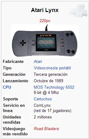 Atari Lynx La Atari Lynx fue una videoconsola portátil de 16 bits producida por Atari. Fue lanzada en 1989, siendo la primera con LCD en color. Si bien era superior a la Game Boy y a la Game Gear, no tuvo demasiado éxito debido a su elevado precio y a la corta duración de las baterías. La capacidad de los cartuchos era de 128KB. Era retroiluminada, y contaba con sonido estéreo. Historia En el año 1987 Epix diseña la primera consola portátil de la historia y la bautiza como Handy. Ante la imposibilidad de lanzarla al mercado, Atari se hace con los derechos del hardware de la misma. Atari no lanzaría la Lynx hasta dos años después, en 1989, con un mercado escéptico tras los fracasos que arrastraba la compañía. Aun así la consola sorprendió por sus caraterísticas técnicas. Con una CPU de 8 bits y un procesador gráfico de 16, el cual permitía realizar efectos como zooms o deformaciones, Atari superaba con creces el nivel del resto de la portátiles. Sin embargo, la portabilidad de la misma quedaba en entredicho dadas sus dimensiones, y la escasa autonomía, debido al alto consumo. El pobre marketing que Atari ofrece a la consola, unido a la mediocridad de algunos de sus videojuegos, dan al traste con las esperanzas que la empresa había puesto en el sector de las portátiles. En la primavera de 1989 Nintendo lanzaba en Japón la GameBoy y tan solo un año después Sega hacia lo propio con su Game Gear, saliendo ambas a la venta en EEUU en 1991. Estas consolas suponían una gran competencia para la Lynx, mucho más cara, grande y con una autonomía mucho menor. Puede catalogarse como de 8 o 16 bits, pues los custom chip (MIKEY) son de 16 bits, pero la CPU (un WDC 65C02) es de 8 bits. Se escoge está frente a la 68000 (utilizada en ordenadores y consolas) porque presenta un mejor uso de bus (la 68000 pierde tiempo en el bus), es más fácil de programar (todos los que han programado para los Commodore 64, Atari XL/XE y Apple // ya lo conocen), y sobre todo es menos cara y puede incluirse en un custom chip (SUZY) (Motorola no permitirá lo mismo en el 68000 hasta 1993-1994) Lynx II La Atari Lynx II fue un modelo posterior con menor tamaño, una mayor autonomía (de unas 5 horas con 6 pilas AA), debido a la posibilidad de apagar la retroiluminación de la pantalla y sonido estéreo; aun así fue un intento fallido el intento de corregir los escasos pero importantes fallos de su antecesora. Al no cumplir sus objetivos, tuvo un corto periodo de vida; por lo que hoy en día es una consola muy apreciada y valorada por los coleccionistas. Accesorios Sintonizador de TV Se rumoreó mucho sobre un sintonizador TV como el de la Game Gear, pero en palabras de uno de los creadores la pantalla LCD de la Lynx era incapaz de soportar imágenes con calidad broadcast. Cable ComLynx El ComLynx es un cable de 3 hilos (Masa, +5v, Datos) que permite conectar hasta 18 jugadores, a velocidades entre 300 y 62.500 baudios. Las señales y el soft se hallan presentes en la Jaguar, por lo que se ha especulado con la posibilidad de conectar ambos equipos (por el momento solo hay juegos Jaguar que pueden utilizar la Lynx como mando de juego). las comunicaciones se realizan en un segundo plano. Si se interrumpe la comunicación, el total de los juegos quedan colgados hasta que se recupera la conexión. Presencia en España En España la Lynx tuvo una buena campaña de lanzamiento, con anuncios a doble página en Micromanía y soporte en grandes almacenes y tiendas especializadas. Pero, como ocurrió en EEUU, el gran fallo de Atari fue no dar cabida a muchos desarrolladores: solo 3 casas entraron inicialmente, y aunque hubo juegos de calidad que la arroparon inicialmente, la aparición de la Sega Game Gear la echaron de la competición ante la avalancha de juegos (no olvidemos que viene con toda la biblioteca de la Master System). Acaba tercera, con la Gameboy como ganadora, seguida de la Game Gear, y tras la Lynx la Nec Turbo Express. Tras el cierre de Atari España, se saldan los restos de la Lynx en El Corte Inglés. Características técnicas Procesador MOS 65SC02 con una frecuencia máxima de 4 MHz (~3.6 MHz promedio) CPU de 8-bit y 16-bit de direccionamiento Sound engine 4 canales de sonido (Lynx II incluye panning) 8-bit DAC para cada canal (4 canales × 8-bits por canal = los 32 bits señalados comúnmente) Video accedido por DMA para la pantalla de cristal líquido Paleta de 4096 colores (12-bit) 16 colores simultáneos (4 bits) de la paleta para cada scanline (más de 16 colores pueden ser mostrados modificando las paletas durante cada scanline) 8 temporizadores (2 están reservados para temporizar el LCD y uno para la UART) Controlador de interrupciones UART (para ComLynx) (formato fijo 8E1, hasta 62500Bd) 512 bytes de booteo y cargador de tarjeta de juegos Suzy (chip de 16-bit diseñado a medida y ejecutando a 16 MHz) Motor gráfico Soporte de dibujo mediante hardware Ilimitado número de sprites de alta velocidad con detección de colisión Efectos de distorsión y mosaico de sprites de alta velocidad controlado por hardware Descompresión y decodificación de datos de sprites controlado por hardware Scroll multidireccional y recorte de imagen controlado por hardware Frecuencia de cuadros variable (hasta 75 cuadros por segundo) Resolución estandard de 160 x 102 (16320 pixels direccionables) Coprocesador matemático Multiplicación de 16-bit × 16-bit → 32-bit via hardware con acumulador opcional; División 32-bit ÷ 16-bit → 16-bit Proceso en paralelo entre la CPU y las instrucciones de multiplicación y división RAM: 64Kbyte 120ns DRAM Almacenamiento: Cartucho - 128, 256 y 512Kbyte (hasta 2Mbyte es posible con intercambio de bancos). Algunos cartuchos "homebrew" traen EEPROM para almacenar puntuaciones máximas. Puertos: Conector de auriculares (minijack 3.5mm stereo; soldado como mono en la Lynx original) ComLynx (comunicación pera múltiples unidades, serial) Pantalla LCD: 3.5" diago
