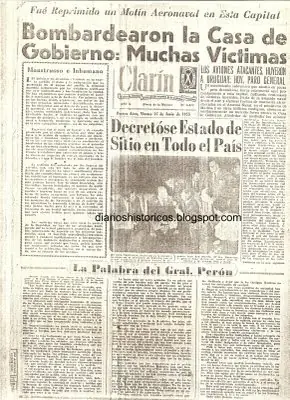 Hace pocos dias se cumplieron 54 años y hay que tener memoria y no olvidar. El 16 de junio, en el mediodía de otoño del año 1955, formaciones de las aviaciones de Marina y Aeronáutica, haciendo su bautismo de fuego, sobrevolaron el centro porteño y descargaron toneladas de explosivos sobre la población civil. El bombardeo dejó, aproximadamente, 350 muertos, cifras nunca confirmadas, como en Guernica, se ocultan los efectos de la masacre, y más de 2000 heridos, entre ellos casi un centenar de lisiados para el resto de su vida. Otras fuentes reflejadas en este trabajo hablan de 700 tumbas cavadas en el cementerio porteño de la Chacarita. En ese ataque participaron activamente jovenes que despues aparecerían como miembros de la dictadura que nos goberno desde 1976 hasta 1983 (los marque con negrita) A continuacion parte del articulo publicado en Argenpress de Juan Carlos Cena y Elena Luz Gonzalez Bazan EL 16 DE JUNIO Previo a este ataque se encuentran otros intentos, como el de Benjamín Menéndez en 1951, familia de golpistas y represores. El mes de junio no era un mes cualquiera en la etapa que vivía el proceso del segundo gobierno peronista. Las contradicciones se profundizaban y continuaron el 10 de junio con la manifestación de la iglesia católica en la procesión de Corpus Chisti, esto, hay que decirlo, excedía lo religioso. Por la noche la quema de una Bandera Argentina, que el gobierno de Perón se lo adjudica a la oposición. El peronismo y antiperonismo eran una realidad. La mañana del 16 de junio de 1955 fue el bautismo de fuego de los aviones de la aeronáutica contra el pueblo, aunque lo quieran negar. Operaron esos aviones los aviadores argentinos, arrojando nueve toneladas y media de explosivos, según algunas fuentes, otras, catorce toneladas sobre la población civil inerme. Fijaron sus objetivos de ataque en los puntos del centro neurálgico de la Plaza de Mayo, la casa de gobierno, donde lanzaron sus bolas de fuego y muerte contra los trolebuses repletos de pasajeros, en su mayoría trabajadores que se desplazaban hacia sus tareas, o bien transeúntes distraídos que recorrían ese lugar histórico, mientras se escondían como podían ante la sorpresiva y violenta lluvia de bombas y metrallas. Eran aviones de la Fuerza Área y de la Marina de Guerra Argentina que actuaron con los mismos objetivos y la misma saña criminal. Aquel 16 de junio, el capitán de fragata Néstor Noriega, de 39 años de edad, esperaba que el cielo se despejara, la escuadrilla formaba escalonada hacia arriba. A las 12,40 Noriega al mando de su Beechcraft descarga una bomba de 100 kilos que cae sobre la sede presidencial; a continuación los North American al mando del capitán de corbeta Santiago Sabarots descargan bombas de 50 kilos cada uno. La Plaza de Mayo era un incendio, quienes salían de las bocas del subte se encentraron con la nube de pólvora, los aviones rasantes sobre el casco porteño, la gritería, la desesperación, la gente intentando esconderse como podía, heridos, muertos, mutilados, así comienza la masacre del 16 de junio. Noriega y Sabarots son los responsables materiales junto a los aviadores de aquel día de masacre, hay otros responsables intelectuales. En el trabajo por recuperar históricamente aquella masacre, realizado por Gonzalo Cháves, titulado la Masacre de Plaza de Mayo, pasa revista a los nombres de muertos y heridos, lugares donde fueron alojados y la cantidad de muertos NN que aparecen en el listado. Por otro lado, Gonzalo Cháves afirma en un reportaje concedido a un diario de Rosario: Me sorprendió descubrir entre los protagonistas de la masacre del 16 de junio de 1955 a hombres y nombres que participaron en el golpe del 24 de marzo de 1976, como los dos secretarios del ministro de Marina Olivieri, que fueron Emilio Eduardo Massera y Horacio Mayorga, dos marinos importantes en el último golpe de Estado. Ellos estuvieron al tanto de lo que iba a pasar y no detuvieron la acción militar contra los civiles. El ministro Olivieri dio parte de enfermo y sólo regresó al despacho dos días más tarde del 16 de junio. Lo mismo hicieron “Emilio Eduardo Massera y Horacio Mayorga, sus jóvenes ayudantes”. De esa investigación se desprende que estuvieron involucrados activos participantes de la última dictadura militar como son: Carlos Suárez Mason y Osvaldo Cacciatore, intendente porteño durante la dictadura, el de las famosas autopistas, que integraba la escuadrilla de la aeronáutica que bombardeó la Plaza de Mayo. Otro de los personajes que estuvo en el bombardeo fue el hermano de Massera, Carlos Massera como piloto de la marina. “La sublevación contó en forma activa con el respaldo de la base naval de Punta Indio que estaba al mando del capitán de marina Néstor Noriega; del BIM 4 (Batallón de Infantería de Marina), asentado en Puerto Nuevo y de parte de la oficialidad de la Aeronáutica hubo dos aviones Catalina que llegaron de la base Espora. La noche del 15 de junio copó Ezeiza, con el objetivo de reabastecerse de combustible y explosivos, porque la base de Punta Indio quedaba muy lejos. De allí los pilotos con sus aviones fueron y volvieron varias veces, entre ellos Cacciatore”, sostiene Cháves. Hay un testigo incomparable, el camarógrafo de Sucesos Argentinos, Carlos de la Fuente, víctima del bombardeo, que a pesar de estar herido, no perdió la conciencia, llegó a contabilizar "pilas de muertos detrás de la Casa Rosada", con una etiqueta atada con un hilo en el dedo gordo del pie con los datos de cada una de las victimas. Dice lacónicamente: todo fue un pandemonium. Siempre se trató de minimizar esta masacre, hecho aberrante y criminal si los hubo. Hoy aparecen una serie de lenguaraces hablando y otros escribiendo sobre el bombardeo a la Plaza de Mayo hipócritamente; otros pidiendo resarcimiento económico para las víctimas, toda una burla caricaturesca, cuando, durante años ni se acordaron de ese pueblo masac