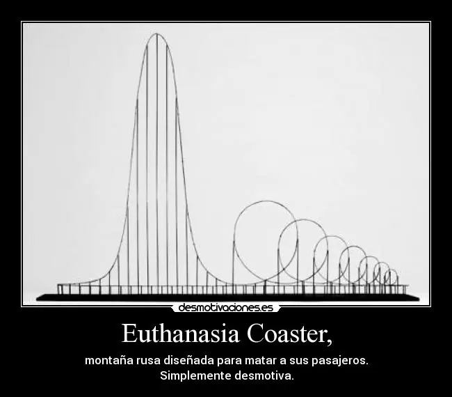 Euthanasia Coaster es un concepto artístico para una montaña rusa de acero diseñada para matar a sus pasajeros. En 2010 fue diseñada y hecha a escala por Julijonas Urbonas, un candidato a doctorado en el Royal College of Art de Londres. Urbonas, que ha trabajado en un parque de diversiones, mencionó que el objetivo de su montaña rusa es tomar vidas "con elegancia y euforia". En cuanto a las aplicaciones prácticas de su diseño, Urbonas mencionó "eutanasia" o "ejecución". John Allen, que fue presidente de la Philadelphia Toboggan Company, inspiró a Urbonas con su descripción de la montaña rusa ideal como una que "se lleva a 24 personas y todas ellas regresan muertas". Como un medio hipotético para la eutanasia, el diseño causó la preocupación de la asociación anti-eutanasia Care Not Killing. Duración3 min 20 s Longitud7.500 m Altura510 m Velocidad máxima360 km/h Actualmente la montaña rusa más alta de Europa es Shambhala: Expedición al Himalaya, para que os hagais una idea: Duración1 minuto Longitud1564 metros Altura76 metros Velocidad máxima134 Km/h La Euthanasia Coaster mataría a sus pasajeros mediante una hipoxia cerebral prolongada, o insuficiente suministro de oxígeno al cerebro. Las siete inversiones del paseo infligirían 10 G a sus pasajeros durante 60 segundos, causando síntomas relacionados con la fuerza G, iniciando con una visión cada vez más gris, pasando por visión túnel, hasta un síncope causado por visión negra (pérdida del estado de conciencia inducido por Fuerzas G). Dependiendo de la tolerancia de un pasajero individual a las fuerzas G, la primera o segunda inversión causarían anoxia cerebral, causando en los pasajeros una muerte cerebral.Las siguientes inversiones servirían como un seguro contra la supervivencia no intencional de pasajeros particularmente robustos. En mi opinion sería bueno que la construyeran para personas con problemas de salud graves o con cáncer avanzado, pero no creo que se contruya ya que requiere mucho terreno link: https://www.youtube.com/watch?v=ZEklVDlqwbQ