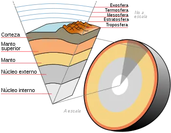 El núcleo de la Tierra es su esfera central, parte del conjunto de capas que forman el planeta. Corte de la Tierra, de núcleo a exosfera. Sólo parte del dibujo está a escala. La densidad media de la Tierra es de 5.515 kg/m3, la mayor del Sistema Solar.1 Dado que la densidad media de los materiales de la superficie es sólo de aproximadamente 3.000 kg/m3, deben existir materiales más densos en el núcleo de nuestro planeta. La sismología nos aporta otras evidencias de la alta densidad del núcleo. Durante la formación del planeta, hace unos 4.500 millones de años, la gravedad hizo que las sustancias más densas se hundieran hacia el centro, mientras que los materiales ligeros flotaron hacia la corteza, un proceso denominado diferenciación planetaria. A causa de esto, el núcleo terrestre está compuesto en su mayor parte de hierro (80%), junto con níquel y varios elementos pesados; otros elementos químicos densos, como el plomo o el uranio, son o bien demasiado raros en la Tierra o propensos a combinación química con elementos más ligeros, y por tanto permanecen en la superficie. Las mediciones sísmicas muestran que el núcleo está dividido en dos partes, un núcleo interno sólido con un radio de alrededor de 1.220 km y un núcleo externo líquido que se extiende más allá de éste a un radio de alrededor de 3.400 km. El núcleo interno sólido fue descubierto en 1936 por Inge Lehmann y se cree que está compuesto principalmente por hierro y algo de níquel. Algunos científicos piensan que el núcleo podría estar en la forma de un solo cristal de hierro.2 3 Se cree que el núcleo externo líquido está compuesto de hierro mezclado con níquel y pocos rastros de elementos más ligeros. Especulaciones recientes sugieren que la parte más interna del núcleo está enriquecida por elementos muy pesados, con números atómicos por encima de 55, esto incluiría oro, mercurio y uranio.4 La mayoría de los científicos cree que la convección del núcleo externo, combinada con la rotación de dicho núcleo causada por la rotación de la Tierra (ver: efecto de Coriolis), causan el campo magnético terrestre a través de un proceso explicado por la hipótesis de la dínamo. El núcleo interno sólido es demasiado caliente como para sostener un campo magnético permanente (ver Temperatura de Curie) pero probablemente actúa como un estabilizador del campo magnético generado por el núcleo externo líquido. Evidencias recientes sugieren que el núcleo interno de la Tierra podría rotar ligeramente más rápido que el resto del planeta.5 En agosto de 2005 un grupo de geofísicos anunció en la revista Science de la Asociación Americana para el Avance de la Ciencia (American Association for the Advancement of Science, AAAS) que, de acuerdo con sus cálculos, el núcleo interno de la Tierra rota aproximadamente de 0,3 a 0,5 grados por año más rápido que la rotación de la superficie.6 7 La actual explicación científica de la temperatura gradiente de la Tierra dice que ésta es una combinación del calor que sobra de la formación de la Tierra, los elementos radiactivos, y la disminución de la temperatura del núcleo interno. Otras teorías incluyen la teoría del georreactor. FUENTE: wikipedia...