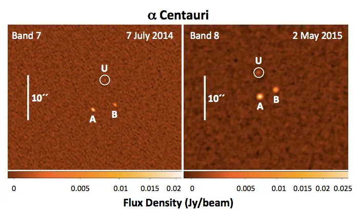 La comunidad astronómica se muestra escéptica sobre el posible descubrimiento de uno o dos planetas muy grandes más allá de Plutón. imagen del objeto misterioso tomada por el radiotelescopio ALMA de la NASA marcado con la U visto con una separacion de 1 año observándose su movimiento sobre el fondo de estrellas, situado cerca de las estrellas A y B de Alfa Centauri (R. Liseau et al.). Parece el cuento de nunca acabar. Desde que se dedujera la existencia de Neptuno gracias las leyes de la mecánica newtoniana y las irregularidades de la órbita de Urano, se ha venido proponiendo la existencia de un gran planeta más allá de Neptuno sin encontrar nada de ello. A este hipotético planeta se le atribuido todo tipo de cosas, incluso de mandarnos cometas y meteoritos al sistema solar interior de vez en cuando. La naturaleza, tamaño y masa de este planeta X varían según las necesidades de la teoría de turno. La última vez que se ha propuesto algo así ha sido hace relativamente poco y la propuesta se basa en la existencia de órbitas excéntricas de algunos cuerpos transneptunianos, aunque hay explicaciones alternativas. El telescopio de la NASA Wide-field Infrared Survey Explorer no encontró en su día señales de posibles planetas más allá de Neptuno, descartando objetos con un tamaño entre el tamaño de Júpiter y el de Saturno. Pero algo del tamaño de la Tierra o un poco mayor se habría escapado a la detección. El caso es que, hasta ahora, ahora nadie ha encontrado planeta alguno más allá de Neptuno (descartando Plutón al ser planeta enano). La situación se volvió un tanto misteriosa cuando una noticia saltó a los medios hace unos días. Según esta noticia el radiotelescopio ALMA podría haber encontrado uno o dos planetas con un tamaño de 1,5 veces el de la Tierra mucho más allá de la órbita de Plutón. Se habría descubierto casualmente mientras se observaba otros objetos en una investigación diferente. Estos astrónomos se percataron de un cambio en la posiciones de los objetos, lo que indicaría que se movían sobre el fondo de estrellas, lo que haría que fuesen candidatos a planetas de nuestro Sistema Solar. El artículo con el posible hallazgo se envió para su publicación el pasado 8 de diciembre a Astronomy & Astrophysics. Copias de los mismos ya se encuentran disponibles en arXiv. El asunto ha levantado bastante revuelo. Las reacciones en las redes sociales y en el mundo académico son más bien de escepticismo. El problema es que el artículo todavía no ha sido aceptado. Es decir, no ha sido aún revisado por un par que trabaje en el campo. A veces se da la costumbre de publicar el artículo de turno en el repositorio arXiv antes de ser aceptado. Por un lado puede servir para que colegas del campo puedan ayudar a perfilar mejor su contenido o, simplemente, ser un acto de clavar la bandera sobre un terreno nuevo que se cree ser el primero en pisar. El sueco Wouter Vlemmings, uno de los autores, no esperaba el impacto de su posible descubrimiento fuera del mundo académico. Uno de los objetos lo denominan provisionalmente Gna (mensajero de los dioses en la mitología nórdica), que está ahora sobre la constelación del Águila. El otro objeto estaría sobre Centauro. Pero las denominaciones son todavía un tanto confusas. El radiotelescopio ALMA detecta ondas electromagnéticas situadas en la gama milimétrica y submilimétrica de longitud de onda. Es un conjunto de muchas antenas parabólicas situadas sobre una gran extensión de terreno en el desierto de Atacama que trabajan al unísono como si fueran un único radiotelescopio gigante. Esta pensado para observar galaxias lejanas y no planetas de nuestro Sistema Solar. Pero aquí viene la circunstancia de que un planeta transneptuniano sería más fácil de ser observado en esa gama de frecuencias que en el visible o infrarrojo, pues a esas distancias del Sol estarían muy fríos y casi no reflejarían luz. De momento sólo han observado movimientos sobre las estrellas fijas en sólo dos observaciones, pero se necesitaría mucho tiempo para determinar sus posibles órbitas. Según el planetólogo Mike Brown (Caltech) es estadísticamente muy difícil que algo así exista en nuestro Sistema Solar, pues ALMA tiene un campo de visión muy pequeño y extrapolando estos dos “descubrimientos” casuales a todo el cielo arrojaría la cifra de 200.000 supertierras en el Sistema Solar, lo que desestabilizaría las órbitas de todos los planetas, incluyendo la Tierra. Eric Mamajek encuentra inconsistencias notables en las medidas lo que le hace dudar de que ambos objetos sean planetas de nuestro Sistema Solar. Lo más probable es que se trate de otro tipo de objeto, por ejemplo algún asteroide mucho más cercano y pequeño de nuestro Sistema Solar o una enana roja lejana o un planeta errante fuera del Sistema Solar. Incluso pueden ser fruto del ruido o ilusiones producidas por el equipamiento aún sin ajustar de ALMA, según algunos expertos del campo como Scott Sheppard. Como él dice, con sólo dos observaciones es algo difícil de tragar. Bruce Macintosh (Stanford University) señala que es una gran casualidad que ambos objetos se “descubrieran” al lado de una estrella brillante, por lo que lo más probable es que sean artefactos residuales o “espejismos” del sistema de observación de ALMA y su complejo sistema de calibración. Pero si están en lo cierto se tratarían de planetas mayores que la Tierra, en su mayor parte hechos de hielo, unas seis veces más lejos del Sol de lo que está Plutón. los 2 estudios científicos publicados por 2 equipos independientes se pueden leer en los siguientes enlaces: