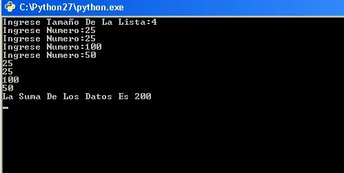 Esta vez les traigo un ejemplo de como sumar los datos de una lista obviamente la lista tiene que tener valores numéricos. Aprenderemos como llenar una lista, como imprimir los valores de la lista, y como ya lo dije antes veremos como sumar todos los datos de la lista. Veamos el código. #------------------------------------------------------------------------------- # Name: Sumar Datos de Una Lisa # # Author: Cristian Torres #------------------------------------------------------------------------------- class Lista: lista = [] suma = 0 def llenarlista(self): x= int (raw_input("Ingrese Tamaño De La Lista:")) for i in range(x): #llenar lista self.lista.append(int(raw_input("Ingrese Numero:"))) #imprimir lista for i in self.lista: print i def sumar(self): for i in self.lista: self.suma+= i print "La Suma De Los Datos Es:",self.suma obj = Lista() obj.llenarlista() obj.sumar() Linea 6 empezamos creando una clase. Linea 7 declaramos la lista vacía. Linea 8 declaramos la variable suma que nos servirá para sumar los datos Linea 9 creamos un método que se encargara de llenar la lista. Linea 11-13 llenamos la lista según el tamaño que aya indicado el usuario. Linea 15 y 16 recorremos la lista e imprimimos los datos. Linea 18 creamos un método que servirá para sumar los datos de la lista. Linea 19-21 recorremos la lista para sumar los datos en la variable suma, y luego la imprimimos. Linea 23 creamos una instancia de nuestra clase Lista. Linea 24 y 25 invocamos los 2 métodos que hemos creado. También puedes encontrarlo en mi blog Blog
