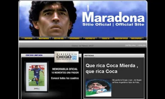 El sitio oficial de Diego Maradona,( ) actual entrenador de la selección argentina de fútbol, ha sufrido una alteración en la sección “noticias”, donde se observa una caricatura del DT consumiendo droga. Pese a que Maradona no está en su mejor momento de popularidad, se puede inferir que el o los autores del hackeo no son argentinos, ya que tras el mensaje “me gusta la droga” se agrega un insulto contra los habitantes del país gaucho. fuente: