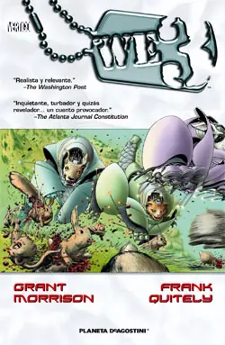 En un centro secreto de investigación de las Fuerzas Aéreas se lleva a cabo un proyecto de desarrollo cibernético que puede resultar revolucionario. Las pruebas se realizan sobre animales domésticos, manipulados quirúrgicamente por los científicos del Proyecto AWE, que han creado un nuevo tipo de cyborg, criaturas de carne y metal diseñadas para imponerse en los campos de batalla del mañana. El mayor éxito de los responsables del proyecto es un trío de prototipos conocido con el nombre clave de WE3, cada uno de ellos construído y entrenado para trabajar como especialista en un equipo. Con sus sistemas nerviosos mejorados y reforzados con hardware militar de última generación, WE3 son el arma definitiva; programables, pero con autonomía, leales, pero despiadados. Numero 1 Numero 2 Numero 3