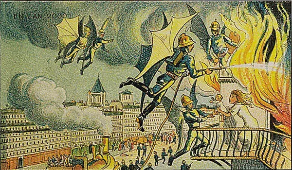 Aquí va una curiosa colección de cromolitografías perteneciente a la Biblioteca Nacional de Francia que muestran como imaginaba el autor en el año 1910, supuestamente un tal Villemard, como sería la vida en el año 2000 con sus adelantos y maravillas tecnológicas. Se especula que estas colecciones eran dibujadas para incluirlas en “comestibles” u otros productos, más o menos como coleccionables de cromos. Es curioso ver como a este autor en particular, pese a que imaginó mil y un ingenios futuristas, no se le pasó por la cabeza que tras un siglo la gente pudiese cambiar su modo de vestir y así los muestra, ataviados a la moda decimonónica. En la primera postal vemos a los bomberos alados del futuro, es algo lógico. ¿Existe algún método mejor para apagar los fuegos en las alturas? Aquí vemos al robot-sastre, por un lado se mete la tela y sale ya cortada y cosida a la medida. ¿Barco?Globo aerostático?… Lo que sea, pero eso sí, con la bandera de Francia. Aquí vemos al zagal tirando de manivela en la máquina del saber. Se exprimen los libros y se pasan por cable a los chavales del futuro, con sus calcetines del futuro…(como el internet xD) Un arquitecto en una caseta dirige por medio de robots la construcción de la obra.pero la caseta parece un baño portatil es algo no??? Una teleconferencia a distancia,todavia me parece un fail que despues de 100 años no pensaba que iban a cambiar de estilo El hombre dicta una carta a viva voz y automáticamente sus palabras se transcriben al papel. El baño autómata, un sueño por cumplir para millones de mujeres. Por el momento la tecnología no lo ha conseguido y se ha quedado la cosa en ese espejo redondo con mil aumentos en el que los granos parecen un volcán