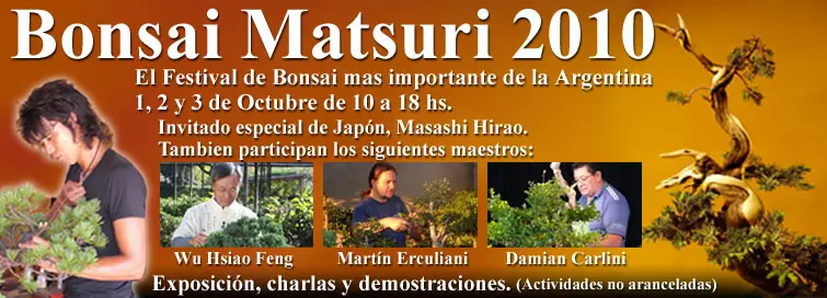 Después de 1:50 hs de viajesito desde luján a palermo y con toda la peregrinación en la ciudad llegué a casa, con algunas fotos del Bonsai Matsuri 2010, organizado en el Jardín Japones No llegué a la primera charla del señor Wu (bonsaista reconocido), si a la del simpáticoMartín Erculiani, quién dio otra bastante inicial sobre el arte del bonsai, más que nada los puntos básicos de lo que trata esta disciplina y su punto de vista ( muy particular) sobre la misma. Alambró un ejemplar y compartió un poco de su experiencia con personas de varias partes del país. 30 minutos después llegó un groso ponja (que por cierto si a el no se le entendía una goma, tenían que escuchar a la traductora xD) el maestro Masashi Hirao (29), discípulo del fallecido Saburo Kato. Grosa gente aficionada y profesional se juntó en el establecimiento para ver la demostración de las nuevas/y no tanto técnicas aplicadas por el joven. Luego de unos cortes radicales a un bonsai (x_x) del señor Wu, un jin, y algunas podas, Hirao demostró su estilo y el nivel con el bonsai. En el complejo del Jardín se encontraban a la venta y en exposición ejemplares de hasta 50 años importandos :baba:, como los expuestos por Domestic bonsai (del señor Pablo, quien me vendió un mame de serissa copado y me dejó con las ganas de un pino blanco que no entraba en mi presupuesto u.u). Obviamente en la carpa exterior estaban organizados los arbolitos concursantes del Matsuri 2010. Lamentablemente no andaba con una cámara de 1° calidad (pienso conseguir mejores fotos y renovar el post) por lo que les dejo las imágenes que saqué a los bonsais más relevantes ( a mi gusto). (ganador del primer premio este de abajo) Este domingo es el último día! así que si quieren aprovechar y sacar provecho de la expo ni lo piensen y dense una vuelta! Y aca yo, cansado de patear para todos lados si comentan no me joden