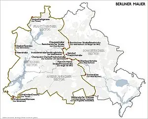 HISTORIA DEL MURO: El Muro de Berlín (en alemán Berliner Mauer), también denominado "El Muro de la Vergüenza" por la opinión pública occidental y "Muro de Contención Antifascista" (antifaschistischer Schutzwall) por la República Democrática Alemana (RDA), fue parte de las fronteras intraalemanas desde el 13 de agosto de 1961 hasta el 9 de noviembre de 1989 y separó el Berlín Occidental del Berlín Oriental y de la RDA, contando con una longitud total de 120 km. Fue uno de los símbolos más conocidos de la Guerra Fría y de la separación de Alemania. Muchas personas murieron en el intento de superar la dura vigilancia de los guardias fronterizos de la RDA cuando se dirigían al sector occidental. El número exacto de víctimas está sujeto a disputas y no se conoce con seguridad. Las cifras de las diferentes versiones oscilan entre 86 y 238 muertos. Historia Recorrido del Muro de Berlín y puestos fronterizos (1989)Cuando en 1949 las tres zonas occidentales se convirtieron en la República Federal Alemana (RFA), empezaron en ambos lados los trabajos de reconstrucción y protección de las fronteras. Mediante la formación de los dos estados se llevó a cabo la separación política. Entre la RDA y la RFA se desplegaron por primera vez policías y los soldados fronterizos y más tarde se construyeron barreras, principalmente por parte del bando Oriental. Berlín se encontraba oficialmente dividida en cuatro sectores desmilitarizados, independientes de ambos estados alemanes, aunque en la práctica esta consideración tenía poca importancia – Berlín Occidental se asemejaba en muchos aspectos a un estado federal de la RFA, contando, por ejemplo, con representantes en el Bundestag. Berlín Oriental fue incluso declarado Capital de la RDA. Con la intensificación de la Guerra Fría, que tras el embargo de productos de alta tecnología COMECON contra el Bloque del Este se tornó en una guerra diplomática y la amenaza militar permanente, se reforzaron las fronteras, particularmente por parte del bando oriental. Las fronteras pasarían con el tiempo de ser una separación entre las dos partes alemanas, a ser parte de la frontera entre la CEE y el Consejo de Ayuda Mutua Económica (COMECON), entre la OTAN y los miembros del Pacto de Varsovia, y también entre las dos ideologías políticas y los dos bloques económico-culturales que se enfrentaban en la Guerra Fría. Desde el establecimiento de la RDA se incrementó la emigración en dirección a la RFA. Desde 1952, las fronteras interiores entre la RDA y la RFA se protegieron con vallas y vigilantes: se creó una zona de 5 km en la que sólo se podía entrar con un permiso especial -típicamente sólo para residentes. Cerca de la frontera había otros 500 m de zona prohibida y en la misma frontera una barrera de 10 m.- Sin embargo, permanecía abierta la frontera entre Berlín Este y Berlín Oeste, difícilmente controlable. Entre 1949 y 1961, unos 2,6 millones de personas abandonaron la RDA desde Berlín Oriental. Sólo en las dos primeras semanas de agosto de 1961 emigraron 47.533 personas. Además, para muchos polacos y checos, Berlín Occidental se convirtió en la puerta hacia occidente. A menudo se trataba de jóvenes bien formados, lo que constituía una amenaza a la economía de la RDA y, en última instancia, la población de los países. Aproximadamente 50.000 trabajadores de Berlín Oriental trabajaban y vivían en Berlín Oeste, pero se aprovechaban de las condiciones financieras favorables de Berlín Este, siendo conocidos como Grenzgänger. El 4 de agosto de 1961 fue decretado por la magistratura de Berlín Este que los Grenzgänger fueran registrados y pagaran el alquiler en marcos de la RFA. Ya antes de la construcción del muro, la Volkspolizei de Berlín Oriental controlaba las calles y los medios de transporte que llevaban a la parte oeste a los llamados refugiados de la República sospechosos y contrabandistas. Además, muchos berlineses occidentales y orientales que trabajaban en Berlín occidental compraban en el mercado negro - con una ventajosa tasa de intercambio para el Marco de Alemania del Este de aproximadamente 1:4 - los relativamente baratos alimentos básicos y los pocos bienes de consumo de lujo de Berlín Este. La economía planificada del sistema del lado oriental fue, en consecuencia, debilitada de esta forma. El muro debía servir a los gobernantes del Bloque del Este como una forma de detener la evasión de los trabajadores y campesinos socialistas mediante el aislamiento. Construcción del muro El plan de la construcción del Muro de Berlín fue un secreto de estado de la administración de la RDA. El muro fue construido a instancias del Partido Socialista Unificado de Alemania —los trabajos se llevaron a cabo bajo la dirección y la vigilancia de la Volkspolizei y de soldados del Ejército Nacional Popular— contra las declaraciones del Presidente del Consejo de Estado Walter Ulbricht, quien, en una conferencia de prensa internacional que tuvo lugar en Berlín Oriental el 15 de junio de 1961, había contestado a una pregunta de la periodista Annamarie Doherr: Entiendo su pregunta como que hay hombres en Alemania del Oeste que desearían que movilizáramos a los trabajadores de la construcción de la capital de la RDA para erigir un muro. No conozco la existencia de tales motivaciones, pues los obreros de la construcción de la capital emplean todas sus fuerzas principalmente en la construcción de casas. ¡Nadie tiene la motivación de erigir un muro!. Ulbricht fue, de esa forma, el primero en emplear el concepto muro – dos meses antes de que se construyese. De hecho, los aliados occidentales fueron informados del acordonamiento de Berlín Oeste por los miembros del plan "Medidas drásticas", pero fueron sorprendidos por el calendario y la amplitud de las barreras. El acceso directo a Berlín Oeste no se cortó, ni fue interrumpido militarmente. El Bundesnachrichtendienst (BND) (servi