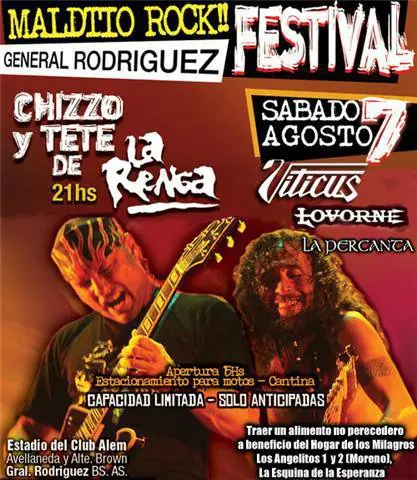 El 7 de agosto se estará desarollando el Maldito Rock Festival en el Estadio del Club Alem (Gral Rodriguez, Bs. As.). A partir d las 15 hs. pasarán por el escenario bandas como La Percanta, Lovorne, Viticus y a las 21 hs. será el gran cierre con la presencia de Chizzo y Teté de La Renga. Habrá cantina dentro del predio y también estacionamiento para motos. Se pide también llevar un alimento no perecedero para donar al Hogar de los Milagros Los Angelitos 1 y 2 (Moreno). Entradas $60 anticipadas en: LOCURAS (Morón – Flores – Belgrano – Once), LA CUEVA (Morón), LASER (Morón), PSICOSIS (Gral. Rodríguez), HALLOWEN (Moreno), X ROCK SHOP (Moreno), PURGATORIO (Moreno), TILCARA (José C. Paz), LAPS ROCK (Pilar), TANGO & ROCK (Luján), SINNER (Luján), LA CABERNA ROCK (Merlo), SCOTT (Merlo), LA ROCKERIA (San Fernando) y MANDINGA (Lugano). Con que viajar: Líneas de colectivos: 57 Atlantida – 276 La Isleña – 365 Independencia – 203 S. A.T.A. (Estación Lemos – Luján) – 501 - 502 La Perlita Línea de tren: Sarmiento. fuente