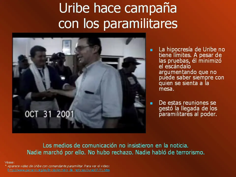 Uribe le concedió a Pablo Escobar licencias para disponer de pistas de aterrizaje El expresidente de Colombia, Álvaro Uribe, concedió docenas de licencias para disponer de pistas de aterrizaje al capo del narcotráfico Pablo Escobar, aseguró la periodista Virginia Vallejo, quien fuera amante del jefe del Cartel de Medellín. "Por Pablo (Escobar) pude saber que (Álvaro) Uribe le concedió docenas de licencias para disponer de pistas de aterrizaje. Me decía que sin la ayuda de 'ese muchachito bendito' estaría trayendo la pasta de coca a pie desde Bolivia", dijo Vallejo en una entrevista a la revista argentina 'Noticias'. Fue organizada con el motivo de la reedición en Argentina de su libro 'Amando a Pablo, odiando a Escobar', lanzado en 2007. Vallejo aprovechó la ocasión para criticar de paso a la serie colombiana 'El patrón del mal', asegurando que el único propósito de la ficción televisiva, que arrasó en Colombia y varios países de América y España, "es tapar el verdadero escándalo que son los crímenes de los narcopresidentes (en referencia a Álvaro Uribe, Alfonso López Michelsen y Ernesto Samper)", mostrando aventuras de alcoba. "Denuncié la complicidad con el narcotráfico de políticos muy importantes de mi país, entre los que había varios expresidentes, pero sobre todo a Álvaro Uribe, que entonces estaba iniciando su segundo mandato", dijo la periodista colombiana exiliada en EE.UU. Escobar, que realizó grandes envíos de cocaína a Estados Unidos, fue tiroteado por las fuerzas de seguridad de Colombia el 2 de diciembre de 1993 cuando huía por los tejados de una vivienda en un barrio de Medellín, donde se ocultó tras haberse fugado el 21 de julio de 1992 de la prisión La Catedral, que el Gobierno de César Gaviria (1990-1994) había construido para alojarlo. En una entrevista inédita publicada recientemente el propio Escobar reveló que "los dineros calientes están incluidos en todos los sectores económicos", al señalar que "el Estado y el mismo Gobierno reciben ese dinero de impuestos de las personas que están sindicadas de comerciar con drogas ilegales". YAPA link: https://www.youtube.com/watch?v=r8L8WW361fI