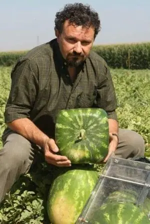 Hace un tiempo atrás, FreshPlaza Italia publicó algunas fotos que se encontraron en la edición en línea del periódico italiano La Repubblica, que mostraba la producción de sandías cuadradas. El inventor, Franco Feroldi (en la imagen) de Casalmaggiore (Cremona, cerca - Región de Lombardía). "Todo empezó en 1995 - Franco dice - yo estaba montando mi coche con una sandía en la cajuela. El camino iba en curva y cuando me detuve encontré que la sandía se había roto en dos. Ese fue el momento en que se me ocurrió crear una sandía cuadrada. Los primeros experimentos se realizaron hasta 1997, cuando logré la creación de la primera sandía cuadrada. Por lo tanto, se la mostré a mis - hasta ese momento escépticos – amigos e inesperadamente, se convirtió en una leyenda. Todos los medios de comunicación italianos corrieron a ver a mi invención y mi fama se extendió rápidamente en todo el mundo". "En el verano de 2001, los japoneses lanzaron su - muy bonita, lo reconozco - sandía cuadrada, presentándolos como una invención propia. Yo declaré que no era un invento japonés, pero pronto me di cuenta de que mi solicitud de patente por sandías cuadradas fue rechazada por la burocracia italiana en 2000 a causa de - por lo que se dijo - una "falla en la realización de inventario !!!!!". "Hoy en día, todavía estoy produciendo mi sandía triangular y sandías y estoy tratando nuevas formas. He trabajado duro para mejorar esta técnica y los últimos resultados son muy buenos. Espero que alguien pueda estar interesado en mis productos. Por otra parte, estoy tratando de dejar que estas sandías se conviertan en una parte de las especialidades gastronómicas de la zona, cerca de Cremona, con el fin de valorizarlas aún más". Desafortunadamente, debido al proceso, las sandías parecen no tener un muy buen sabor ya que no llegan a madurar completamente así que solo se encuentra en exhibición. Alguna imágenes de los productos obtenidos: Fuente: http://www.freshplaza.es/news_detail.asp?id=9105