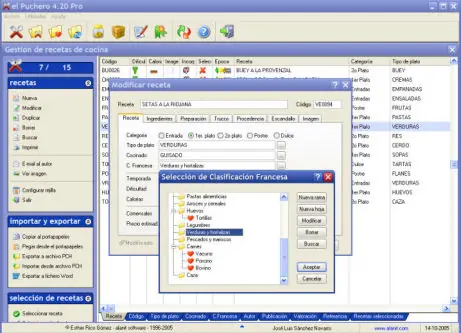 Registrate y eliminá la publicidad! El puchero: gente como muchos de nosotros somos amantes de la comida, y siempre le andamos pidiendo cosas nuevas a la abuela, mama o esposa. Este programa permite tener todas las resetas ordenadas en la computadora. Bueno aca una breve reseña sobre este programa. el Puchero es un programa de gestión de recetas de cocina. Permite almacenar información sobre recetas de cocina clasificandolas por tipos de plato, por tipo de cocinado y en forma arborescente mediante la llamada clasificación francesa. Tiene funciones avanzadas de búsqueda de recetas por múltiples críterios. Incorpora un fichero de ingredientes que permite realizar escandallos, fichero de proveedores de ingredientes, tabla de valoraciones de las recetas, fichero de autores y de publicaciones y sitios web relacionados con la cocina. Permite importar y exportar conjuntos de recetas en un formato propio, teniendo disponibles miles de recetas para su descarga desde nuestra web. BUENO PARA EL QUE LO QUIERA BAJA ACA EN ESTE LINK ESTA TODO EL PROGRAMA Y MILES DE RESETAS: http://www.alanit.com/descargar.php Saludos, espero que coman,,... comenten