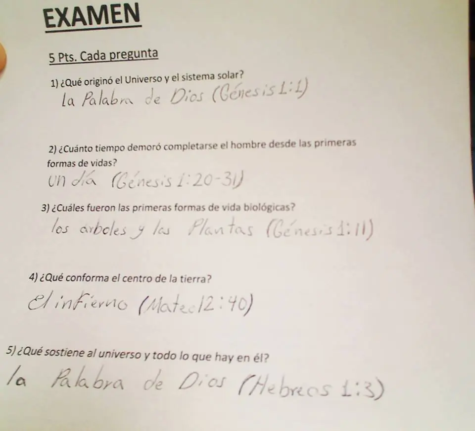 Profesor: -¿Usted cree que esto es un juego? Alumno: -No profesor, solo respondí la verdad. Profesor: ¿Cómo que la verdad? ¿Usted cree que el universo lo creó Dios? Alumno: ¿Usted cree que el perfecto orden del universo lo creó una explosión? es absurdo y anti científico! Eso iría en contra de las leyes de la termodinámica "el orden tiende al caos" ¡no el caos tiende al roden! Profesor: -mmm aja y ¿cómo es que el hombre se formó en un día? ¿Está loco? Alumno: -No profesor, loco está usted al creer en fábulas y mitos. La evolución es totalmente anticientífica, ya que solo está basada en extremos teóricos y en especulaciones! Un hecho científico tiene que ser observado y repetitivo, hasta los momento solo se han utilizados fósiles que todos resultan pertenecer a un animal o a un hombre enfermo. La biblia dice que el hombre fue formado de la tierra, y actualmente se ha descubierto que los elementos químicos que forman la tierra (cal, hierro, azufre, potasio, flúor, calcio, fósforo, cloro, yodo magnesio) y los gases que contiene (oxígeno, nitrógeno, carbono e hidrógeno)… ¡son los mismos que contiene el cuerpo humano! además científicos de la universidad de Cornell, demostraron que el barro dio origen a la vida. Tal cual como Dios lo ordena en Génesis 1:24 Profesor: mmm ujum! la única respuesta correcta fue la tercera, pero ¿por qué puso un pasaje en la biblia? Alumno: ¡porque ahí lo dice! ¿Quién le reveló a Moisés hace 3.500 años que La luz, el agua y el oxigeno, fueron el fundamento para la existencia de la vegetación, que fue la primer forma de vida? ¿Quién les reveló este orden? Profesor: -estemmm bueno, pudo ser un extraterrestre! bueno eso no es lo que importa!! ¿Cómo es eso que el infierno está en el centro de la tierra? ¿Usted lo vio? Alumno: -¿Y usted u otro hombre viajó hasta el centro de la tierra? Profesor: Bueno! ¿y como es eso de que la palabra de Dios sostiene el universo? Alumno: y qué otra cosa lo sostiene? ¿la hipótesis de la materia oscura? Que no puede ser detectada por ningún medio, mas que en la imaginación. Profesor déjeme decirle que su fe es mas grande que la mía.