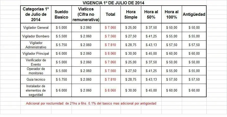 Escala Salarial UPSRA 2014-2015 UPSRA ahun no ha publicado oficialmente la nueva escala Salarial que ya estaría en vigencia, hasta Julio del 2015. Esto es porque aun no se ha homologado en el Ministerio de Trabajo. En 2012 y 2013, la homologación salio con fecha de Agosto y esto le sirvió a muchas empresas para no pagar el mes de Julio con aumento, si bien luego deben pagar un retroactivos, quienes trabajan en esta actividad saben que eso muy pocos lo hacen y si lo hacen, liquidan mucho menos de lo que corresponde Clausula Quinta del Convenio "CLUSULA 5 QUINTA DEL CONVENIO , SE ABONARA UNA CIFRA NO REMUNERATIVA POR UNICA VEZ DE 3060 PESOS,CON UN DESCUENTO DEL 3% PARA LA OBRA SOCIAL OSPSIP ,PARA TODOS LOS TRABAJADORES DE SEGURIDAD PRIVADA COMPRENDIDOS EN ESTE CONVENIO. SE PAGADRA EN 12 CUOTAS CON VIGENCIA 1 DE JULIO 6 CUOTAS JULIO .AGOSTO,SETIEMBRE,OCTUBRE , NOVIEMBE Y DICIEMBRE DE 310 PESOS CADA UNA . Y 6 CUOTAS ENERO 2015 ,FEBRERO ,MARZO,ABRIL ,MAYO Y JUNIO 2015, DE 200 PESOS CADA UNA" Por tanto..... la nueva Escala Salarial, actualizada y con el apartado de la famosa clausula 5ta.! Muchas Gracias como siempre!!!!