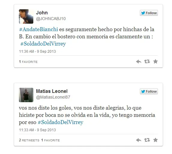 Luego de la dura derrota ante Olimpo los hinchas del Xeneize (y algunos infiltrados) comenzaron un debate sobre el entrenador. EL VIRREY. Banca y crítica para Bianchi. Hay caídas que duelen y hacen ruido... y la que sufrió el Xeneize en Bahía Blanca fue una de ellas. Luego de del gran triunfo ante Vélez, se volvió a ver la peor versión de este Boca, que no contó con tres de sus principales figuras: Agustín Orion, Fernando Gago y Juan Román Riquelme. Minutos después del partido ante Olimpo, la furia se trasladó a Twitter: #AndateBianchi, con colaboración de hinchas de varios equipos, fue el primero en transformarse en TT, aunque la respuesta no tardó en llegar con el #SoldadoDelVirrey. Mientras, los usuarios votan: ¿esto es responsabilidad del DT? Hace una semana, Ramón Díaz decidió cerrar su cuenta en la red social por "la falta de memoria de unos pocos". Un fútbol cada vez más exitista no perdona ni a los intocables. Explotó Twitter: #AndateBianchi vs #SoldadoDelVirrey