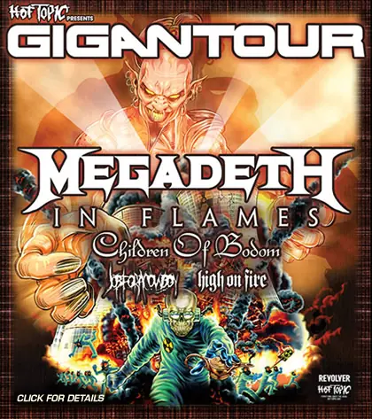 Chicos, para los fanas o los q qieran ir a verlos... siii, vuelve megadeth. Aca dejo lo q dijo Dave Mustaine en la web fechado el 25 de marzo de 2008 Droogies! Qué torbellino ha sido esta parte de la gira. Recién ahora comienzo a recuperar mis sentidos. Estoy escribiendo esto para actualizarlos sobre todas las mega-cosas y Gigantour. Como muchos de ustedes han visto sin dudas, la nueva edición de Revolver salió conmigo y los talentosos muchachos de Gigantour de éste año adornando la portada. La foto fué una gran indicación de la química que creo que hará de éste el mejor Gigantour hasta ahora! Las fotos internas fueron mi impresión de una visera para el pelo y creo que de la película favorita de los editores, “There’s something about Mary.” (Loco por Mary en Argentina) Oh bien, no puedes ser un Dios en la portada Y en el interior también. Como he dicho en muchas entrevistas ultimamente, quería a Children of Bodom en el primer Gigantour en el 2005 con Dream Theater y Fear Factory, pero las circunstancioas lo hicieron imposible. Bueno, todos ganamos éste año porque estamos agraciados con el talento de Alexi Laiho de COB y su gente. Y añadan a nuestros invitados especiales de In Flames, y las bandas soporte Job for a Cowboy y High on Fire, y verán por qué estoy mas emocionado éste año, que en otros Gigantour hasta ahora. No me malinterpreten; todos han sido grandiosos hasta ahora. Sólo estoy emocionado por salir con tanto talento internacional ésta vez – para mezclar – y me encantó como lo hicimos con Job for a Cowboy durante las fechas de Gigantour.2008.UK. Hablé con Chris Broderick hoy, y luego con Shawn Drover y extraño a mis compañeros de banda mucho. Ha pasado mucho tiempo desde la última vez que extraño a los muchachos luego de un tour; usualmente era, “Nos vemos luego . . . ok Sam . . . nos vemos mañana Ralph . . .” así que es un gran sentimiento. Le dije a mi hijo Justis (se está quedando conmigo un tiempo) que debería comenzar sus lecciones con Chris, y que yo también las tomaría, ahora que Chris está fuera del mercado y es un "dios del metal" de Megadeth de tiempo completo en entrenamiento. Y estaremos agregando una nueva canción del disco United Abominations al set. Así que el volverá aquí cuando regrese de hacer snowboarding con su novia Stephanie. Consideré ir, pero la maldita nieve es demasiado fria, así que me quedaré a surfear con Justis y uno de nuestros queridos Droogs. Rulo de tambor: si es verdad . . . la tienda Official Megadeth Ebay ha reabierto y nuestro Storekeeper es una srita. llamada Kellie Payne. Algunos de ustedes tal vez conozcan a su marido Jeff Payne. Jeff es lider del street team de San Diego, me dijo. Y muchas gracias para vos Painkiller! Jeff me ayudó a conseguir mis tablas de surf cuando me mudé aquí al condado de S.D. donde el trabaja llamada TDK Surfboards. También tiene experiencia con el diseño y programación y ayudó a que las subastas se vean bien, y van a estar mejor. Estamos tratando de mantener esta primera ronda de cosas simple asi nuestro Storekeeper puede acostumbrarse a ustedes. Hemos hecho algunas mejoras en la tienda, y estamos tratando de realizar mejoras aún más grandes en cuánto a cómo manejamos a los consumidores. Una cosa genial también, es el debut de las cosas de Chris (y basura sin sentido), como también más ítems de Shawn y James. Kellie y Jeff han traído grandes maneras de ahorrar dolor a ustedes y nosotros, y hemos hecho la tienda mucho más excitante también. Espero que la exploren, va a haber todo tipo de cosas locas que en los próximos dos o tres meses. Limpieza de la casa, la limpieza del estudio, mejorando mi favorito nuevo proyecto TheLiveLine y también Leyendas Café y también - les dije que sería bueno y ahora tienen un chico muy ocupado. Además, muchas gracias a todos por ayudar a comprar la bomba de agua para el orfanato de Mexico. Los quiero a todos por ello y les agradezco. Ok, ahora, para ser concretos, vamos a salir el 8 de abril de Denver para comenzar la gira y va a finalizar en Venezuela, y de lo que dice nuestra tentativa de gira, con un show chileno, dos argentinos, y tres o cuatro en Brasil también. Volvemos a casa el 12 de junio y que es cuando el verdadero trabajo va a comenzar y la diversión de tocar en vivo para ustedes en el último año y, a continuación, algunos extremos. Hemos tenido un gran recorrido, con el Tour Heaven and Hell hemos hecho algunos grandes amigos a lo largo del camino. La prensa fue abrumadoramente positiva, y la marea parece haber transformado nuestra forma de nuevo. Estoy super avivado que le han dado la bienvenida a nuestra marca de metal en sus ordenadores, su iPods, su reproducción unidades - independientemente de lo que es - y de cintas, así como a los fieles aficionados que han luchado para mantenernos en la vanguardia de nuestro Gran nación de mentes (y la bastidores en el registro de los almacenes). Por ahora, sólo sabemos que James y yo tenemos tres proyectos para editar y mezclar, los cuatro tienen el siguiente registro de escribir, y recuerdo que ahora tengo Chris, un super-arma secreta y tiene algunas otras canciones de su manga Que aprendió a mezclar los juegos. Tengo mucho trabajo que hacer para mantener mi espíritus y les doy las gracias a todos por sus pensamientos positivos y sus oraciones. De manera que es tipo de todo por ahora. Lo comprobaré en unos pocos días después de desempaquetar y arreglar mi maleta y en mi casa en la playa con mi hijo. Estoy fuera de la playa por ahora y decir gracias a cada uno de ustedes como se pone el sol en otro día en mi pequeño mundo. Fuentes: http://foros.matiasm.com.ar/principal/1540-megadeth-en-sudamerica-2008-a.html http://www.gigantour.com/home.php Igual, todabia no se hagan ilusiones por q todabia no esta muy confirmado.