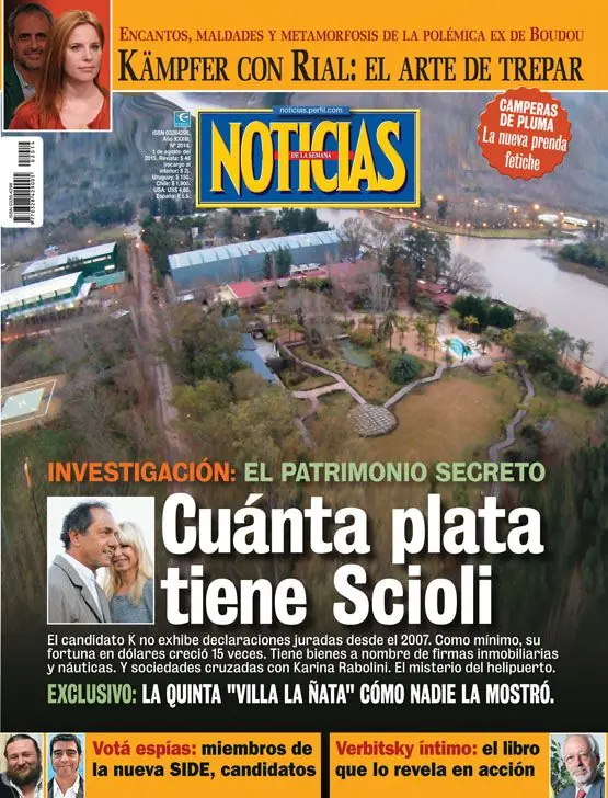 Cuánta plata tiene Scioli Sus empresas desconocidas y su quinta “La Ñata” como nadie la mostró. ¿Quién está detrás del misterioso helipuerto? La fortuna oculta de Scioli: Por primera vez NOTICIAS muestra La Ñata, el refugio de Daniel Scioli. Por qué no exhibe su declaración jurada. Detalles de la vida dentro de la casa del gobernador bonaerense. El arte de trepar: La historia detrás del inesperado romance entre Agustina Kämpfer y Jorge Rial. Flexibilización amorosa, política y star system. Candidatos SIDE: Los dos agentes de la ex SIDE que serán candidatos por el Frente para la Victoria en la provincia de Buenos Aires. La polémica. Derechos Humanos: El libro de Santiago O’Donnell y Mariano Melamed destapa la intimidad de cómo llegó Horacio Verbitsky a hacerse cargo del CELS y cómo el periodista se convirtió en el nexo con los Kirchner y su política de Derechos Humanos.
