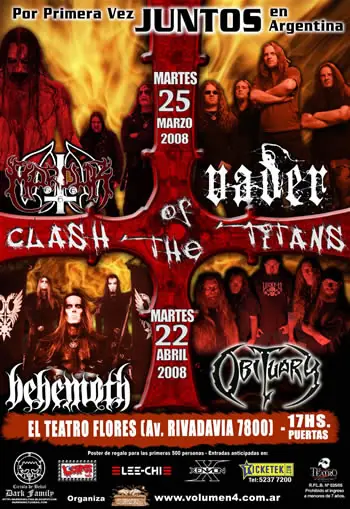 Behemoth - Obituary MARTES 22 DE ABRIL El Teatro Flores Av. Rivadavia 7800 17hs.(Puertas) Entradas Anticipadas con descuento hasta el 31 de Diciembre. Marduk - Vader Dos Bandas Asesinas Por Primera Vez JUNTAS En Argentina. MARTES 25 DE MARZO El Teatro Flores Av. Rivadavia 7800 17hs. (Puertas) Entradas Anticipadas con descuento hasta el 31 de Diciembre. Volumen4