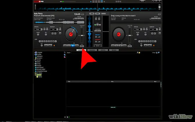 Pasos 1Descarga el software del Centro de Descargas de Virtual DJ y sigue la guía para instalar el software en tu computadora. Anuncio 2Abre el programa y familiarízate con su diseño. Hay 4 áreas principales que necesitas conocer.Forma de onda Activa: esta es la ventana de ritmo donde puedes ver el ritmo de la canción que se está ejecutando y emparejar visualmente la música con el ritmo subyacente. La forma activa consiste de dos partes. La parte superior muestra la dinámica musical. Las marcas representan sonidos fuertes, como un golpe de tambor. Esta parte te ayudará a seguir el ritmo principal de tu pista de mezclas. La parte inferior muestra la Grilla de Ritmo Computado (CGB, por sus siglas en inglés). Esta parte marca uniformemente el tempo de la canción para que puedas seguir el ritmo incluso cuando no se pueda escuchar. Esto vuelve muy útil al CGB durante las introducciones de las canciones, los puentes y los cierres.Escritorio Izquierdo: esto es una versión virtual de un escritorio de un DJ a tu izquierda que copia las funciones de un fonograma convencional.Escritorio Derecho: el escritorio derecho es lo mismo que el izquierdo, pero a la derecha te permite reproducir y editar pistas simultáneamente.Mesa de Mezclas: puedes ajustar los volúmenes de los escritorios derecho e izquierdo y otros aspectos del audio usando la mesa de mezclas. 3Mira bien las características del diseño del programa para que sepas de lo que es capaz el software. La mayoría de los botones virtuales están marcados con símbolos que pueden ser fácilmente comprendidos.Reproducir/Pausa: te permite pausar una canción y reproducirla desde el principio o desde una posición pausada.Detener: detiene la canción y la rebobina al principio.Ritmo Fijo: fija el tempo de la canción y se asegura de que todas las tareas sean sincronizadas para coincidir con el ritmo. Por ejemplo, si intentas rascar un disco en el escritorio izquierdo o derecho el ritmo fijo se asegurará de que el disco continúe reproduciéndose coincidiendo con el ritmo después de que lo hayas rascado. Ritmo fijo es la característica que hace que Virtual DJ aventaje a los equipos convencionales para disc jockeys.Tono: te permite incrementar o disminuir la velocidad de la canción, también conocida como Golpes Por Minuto (o BPM, por sus siglas en inglés). Moviendo el control hacia arriba se frena la canción, y moviéndolo hacia abajo aumenta los golpes por minuto. Esta característica de edición de sonido resulta útil si quieres incrementar o disminuir la velocidad de pistas combinadas. Anuncio Consejos Puedes hacer que caso todos los controles de mezcla de audio regresen a sus niveles originales soltando el control y haciendo clic derecho en él.Usa Virtual DJ Home Edition si sólo quieres usar las características básicas del software. Esto ahorrará espacio en tu disco duro y también te dará una interfase más simple para trabajar.