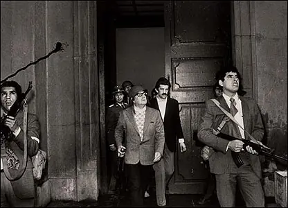 Salvador Allende Político chileno, líder del Partido Socialista, del que también fue cofundador en 1933. Fue presidente de Chile desde 1970 hasta el golpe de estado dirigido por el general Augusto Pinochet el 11 de septiembre de 1973, día en que falleció en el Palacio de la Moneda, que fue bombardeado por los golpistas. Salvador Allende perteneció a una familia de clase media acomodada. Estudió medicina y, ya desde su época de estudiante universitario, formó parte de grupos de tendencia izquierdista. Más tarde, alternó su dedicación a la política con el ejercicio profesional. Participó en la elección parlamentaria de 1937, y salió elegido diputado por Valparaíso. Fue ministro de sanidad del gabinete de Pedro Aguirre Cerdá entre 1939 y 1942. A partir de entonces se convirtió en líder indiscutible del partido socialista. En 1952, 1958 y 1962 se presentó a las elecciones presidenciales. En la primera ocasión fue temporalmente expulsado del partido por aceptar el apoyo de los comunistas, que habían sido ilegalizados, y quedó en cuarto lugar. En 1958, con el apoyo socialista y comunista, quedó en segundo lugar tras Jorge Alessandri. Finalmente en 1970 llegó a la presidencia tras unas duras elecciones. El 11 de Setiembre de 1973, el principio del fin El 10 de septiembre, a las 16:00, zarpó la escuadra tal y como estaba previsto, ya que debía participar en las maniobras navales internacionales UNITAS. Mientras tanto, el Ejército se acuarteló. La razón dada: el probable desafuero de Altamirano y Garretón el día 11. Este desafuero, según explicó Pinochet al ministro de Defensa, Orlando Letelier, podía causar disturbios, por lo que se hacía necesario el acuartelamiento.[60] En la madrugada del 11 de septiembre, la escuadra reapareció en Valparaíso y las Fuerzas Armadas tomaron la ciudad. El prefecto de Valparaíso, Luís Gutiérrez, realizó una llamada por su teléfono (su línea fue dejada libre a propósito), para avisar al subdirector de Carabineros, general Jorge Urrutia, que la infantería de marina estaba en las calles y había empezado a tomar posiciones de combate. Urrutia telefoneó a Allende, que se encontraba en su residencia de Tomás Moro. Allende, calmado, pidió ubicar a Pinochet y a Leigh, pero eran inubicables. A las 7:15, Allende, en su Fiat 125, y el GAP se enfilaron hacia el Palacio de la Moneda, llegando veinte minutos después. Cargaba con un fusil AK-47 (regalo de Fidel Castro) y el GAP ingresó al palacio de Gobierno dos ametralladoras y tres lanzagranadas RPG-7, además de sus armas personales. Paralelamente, llegó a esa hora Pinochet al Comando de Comunicaciones, un poco retrasado. Se organizaron las redes de comunicaciones con las demás ramas de las Fuerzas Armadas, especialmente con Leigh, que se encontraba en la Academia de Guerra Aérea, y con Patricio Carvajal, que sería el coordinador de todo el golpe. Sepúlveda, director general de Carabineros, llegó a la Moneda y le aseguró que Carabineros sigue fiel al gobierno. Lo ignoraba, pero Carabineros está ahora controlado por los generales Mendoza y Yovane. La Cadena Democrática, formada por las radios Minería y Agricultura, emitió la primera proclama militar. Allende debía hacer entrega inmediata de su cargo a la Junta de Gobierno, integrada por los jefes supremos de las Fuerzas Armadas: Pinochet, Leigh, Merino y Mendoza (los dos últimos recién autonombrados como jefes supremos de sus ramas, Armada y Carabineros respectivamente). Se le dio también al presidente un ultimátum: si La Moneda no era desalojada antes de las 11.00, sería atacada por tierra y aire. Carabineros retira las tanquetas y al personal apostados frente ella Los militares se contactaron con la Moneda y propusieron sacar del país al presidente, pero Allende rechazó la oferta. Pinochet se contacta con Carvajal, quien le indicó la negativa del presidente a rendirse. A las 9.55, los tanques del general Palacios ingresaron en el perímetro de la Moneda. Francotiradores apostados en los edificios aledaños los trataron de repeler y se inició una balacera. A las 10:15, a través de radio Magallanes —la única pro gobierno que aún no era silenciada— Allende emitió su último mensaje a la Nación.[62] A las 10:30, los tanques abrieron fuego contra la Moneda. Los siguieron las tanquetas y la infantería, fuego que fue respondido por los miembros del GAP y los francotiradores apostados en los edificios aledaños. Estatua de Salvador Allende frente al Palacio de La Moneda Carvajal se comunicó nuevamente con Pinochet, informándole de la intención de parlamentar. Pinochet exigió una «rendición incondicional». A las 11:52, los cazabombarderos Hawker Haunter iniciaron su ataque a la Moneda, disparando en cuatro oportunidades sus cohetes sobre la casa de Gobierno: el daño causado es devastador. Otros dos aviones bombardearon la residencia presidencial de Tomás Moro, a la sazón defendida por los miembros del GAP que no alcanzaron a llegar con Allende. El ataque al Palacio de Gobierno prosiguió con el uso de gases lacrimógenos, pero al ver que la Moneda todavía se negaba a rendirse, el general Palacios decidió tomarla y envió a un grupo de soldados a derribar la puerta del Palacio. Son las 14:30 de la tarde. Allende decidió rendirse y deponer las armas. Entonces —según el testimonio de uno de sus doctores, Patricio Gijón, que regresó para llevarse su mascarilla antigás—, con el fusil AK-47, se suicidó disparándose en la barbilla, explotando la bóveda craneana y muriendo instantáneamente. Palacios entró en el Salón Independencia y se encontró con Allende y el doctor Girón. Reconoció al presidente por su macizo reloj Galga Coulde. Llamó al oficial de radio y entregó su escueto informe: «Misión cumplida. Moneda tomada, presidente muerto». A su vez Carvajal, dice por interno a Pinochet: "Hay una comunicación, una información de personal de la Escuela de Infantería que est