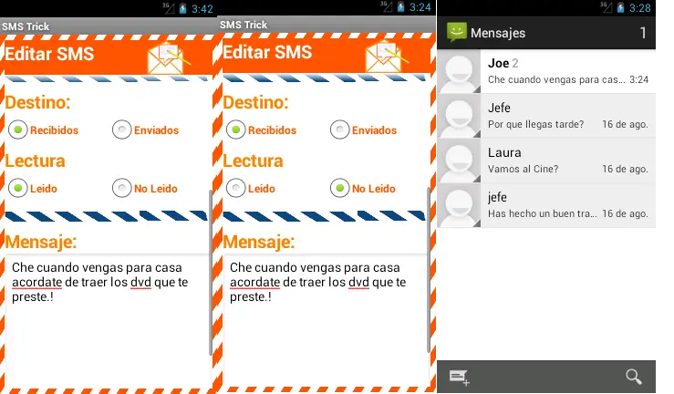 Hola amigos de Taringa mi nombre es sebastian soy un programador de buenos aires y quiero compartir con uds una aplicacion para Android que hace poco termine y publique en el Google Play Store. La aplicacion se llama SMS Trick es ideal para Trollear a tus amigos, novia, jefe, zafar de problemas,etc lo que permite es crear mensajes de texto falsos en tu telefono (ok uds diran naaaa esto ya se vio no es nuevo) pero tambien permite 'Modificar' mensajes de texto que ya recibistes o mandastes, esto lo que tiene de novedoso. seguro diran naa pero ahora todo el mundo usa whatsapp pero tengamos en cuenta que todavia se siguen mandando sms. uds diran entonces la app permite que? ok veamos algunos ejemplos suponete que alguien te mando un mensaje y no lo leiste o no le diste importancia y despues resulta que era algo importante. veamos la sig imagen: como muestra la imagen con cambiar el estado de lectura de leido a no leido basta. en nuestro telefono depende de la version de android les va salir la notificacion de q les llego un mensaje o que tienen uno no leido. Gracias a esto podemos hacerlos los boludos y decir uhh recien me llego debe estar lenta la red o alguna excusa echandole la culpa al proveedor Otro ejemplo suponete que queres hacerle una joda a un amig@ en una fiesta o reunion diciendole q te llego un mensaje contandote que salio del closet seria asi. Con simplemente seleccionar "Crear Mensaje Falso" , elegir el contacto y escribir el texto basta, luego se lo mostras a tu amig@ y le podes decir "che, gracias por confiar en mi y confesarlo. yo te banco" y ahi va a dudar ahora si era verdad y no se animaba a contartelo a bancarsela despues jaja. Esos son algunos usos que se me ocurrieron seguramente a uds se les van a ocurrir un millon mas. La aplicacion solamente funciona en Smartphones Android con 2.2 o superiores Por el momento la 1° semana va a estar disponible gratis despues no se. Puden descargarla desde el Google Playstore haciendo click en la imagen posterior ADVERTENCIA El usuario se hace responsable por el uso y las consecuencias de esta aplicación. Era eso solamente espero que les guste, cualquier consulta o sugerencia pueden comentar y si se copan pueden calificarlo en el store. Gracias... Saludos