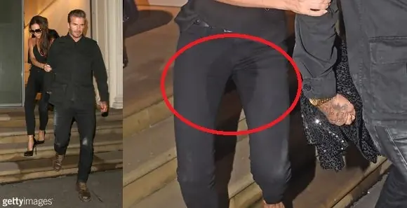 David Beckham tuvo que irse de raje de una fiesta porque parece que a su jermu se le alflojó el cuerito y se pilló encima. Las fotos muestran a la pareja yéndose a los piques mientras Victoria Beckham no podía ocultar una aureola en la entrepierna . Sin embargo, después declararon que a la ex Spice Girl "se le volcó una copa encima".