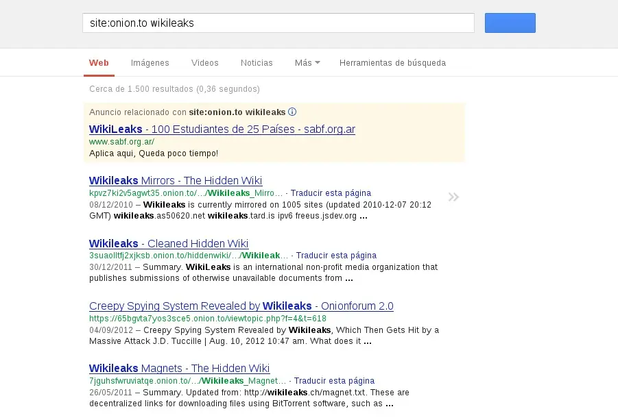 Buscar en la Deep Web usando Onion.To y Google Google tiene indexadas casi 94.000 páginas, así que buscar cosas en los dominios .onion es tan sencillo como usar el comando site:onion.to y los términos que te interesen. Por ejemplo, si buscamos algo sobre wikileaks: o sobre Julian Assange Además, si quieres ir a un sitio onion en tu navegador, basta con que pongas un .to al final y listo. Con esta forma de buscar en los dominios .onion tendrás por supuesto toda la potencia del hacking con buscadores disponible, por lo que si quieres jugar más, ahí tienes todo un campo de batalla.