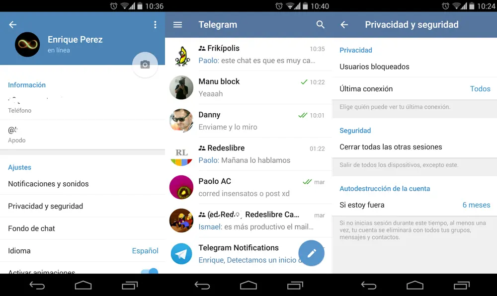 El maximo rival de Whatsapp trae consigo el popular material design en Android En esta versión 2.0 se ha renovado totalmente el diseño. Ahora tenemos un botón flotante ya clásico, un menú lateral donde veremos nuestro perfil, las opciones de crear nuevos chats y acceso a los ajustes. Dentro de estos últimos se ha creado un nuevo apartado de privacidad y seguridad donde se introduce una nueva opción de autodestruir la cuenta en un periodo determinado, ya sea un mes, 3,6 meses o un año. Por toda la aplicación se añaden las animaciones de Material y sus clásicos Menús, lo que le da un aspecto clásico pero renovado respecto a su versión anterior estilo Holo. Tambien hay que destacar que en esta versión se pueden enviar gifs animadosy confgurar que contacto puede ver nuestra última conexión. ¿Utilizas telegram? Google Play play.google.com/store/apps/details?hl=es&id=org.telegram.messenger[ Via el Androide Libre http://www.elandroidelibre.com/2014/11/telegram-2-0-ahora-con-material-design-autodestruccion-envio-de-gifs-y-mas-apk.html