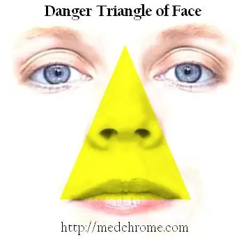 Suena a novela, y sin embargo todos tenemos uno ante nuestros ojos… o debajo de ellos, mejor dicho. El “triángulo de la muerte” es un nombre pintoresco que se le da a la región de la cara que hay desde el labio superior al entrecejo, y que se debe a una peculiaridad de su drenaje venoso. Recordarás del colegio que las venas, al contrario que las arterias, tenían válvulas para favorecer el flujo de la sangre, impidiendo que retrocediera. Pues bien: las venas que drenan esta área carecen de esas válvulas, pues la sangre ahí no necesita tal ayuda. Dónde está el problema, te preguntarás. Imagina te ha salido un forúnculo, un grano bien hermoso. Tan gordo que pasan bacterias a la vena facial, cuya sangre no encuentra ningún obstáculo para refluir hacia el interior del cráneo y hacer un “grumo” de sangre infectada (tromboflebitis séptica) en las venas intracraneales, concretamente en el seno cavernoso o alguna de sus afluentes (venas oftálmicas o cerebrales). Este evento, aunque es raro, les cuesta la vida a un 20-30% de los enfermos: por eso lo del triángulo de la muerte. Y, aunque no mueran, muchos quedan con secuelas debidas a la afectación de los nervios oculomotores que atraviesan el seno, o a una meningitis secundaria. Y por eso se insiste en que no se deben manipular los granos de esa zona de la cara, no sea que al remover semejante masa de bacterias estemos empujando un puñadito hacia donde no deben… fuente http://perarduaadastra.eu/2011/03/el-triangulo-de-la-muerte/