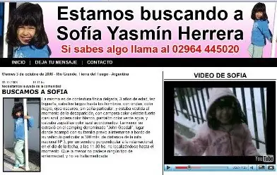 Registrate y eliminá la publicidad! Fue vista por última vez el 28 de septiembre. Su madre pidió aumentar la recompensa y prometió no denunciar a quien se arrepienta y la devuelva Recompensa, identikit ,carpa de protesta y hasta una web con fotos de la pequeña no fueron suficientes para dar con su paradero. Ayer se cumplieron tres meses de la desaparición de Sofía Herrera, el pasado 28 de septiembre, cuando pasaba un día en familia en un centro recreativo de la provincia de Tierra del Fuego. María Elena Delgado, la madre de Sofía, insiste en que fue "secuestrada" y pidió a las autoridades del Gobierno que aumenten la recompensa de $100.000 ofrecida para dar con su paradero. Además, quiso dejar en claro que la familia no efectuará denuncia alguna contra aquel que se arrepienta y devuelva a su hija. "El camping ya está habilitado, se sigue con el rastrillaje, pero no hay nada concreto. Es increíble, pasaron tres meses y no se sabe nada en una provincia que es muy chica", sostuvo la madre de la nena. $ 30.000 por un dato de Sofía Lo dispuso el gobierno fueguino. Sofía Herrera desapareció hace dos días en un camping de Río Grande, mientras estaba con sus padres. Tiene 3 años. identikit del sospecho fuente http://criticadigital.com/index.php?secc=nota&nid=16372