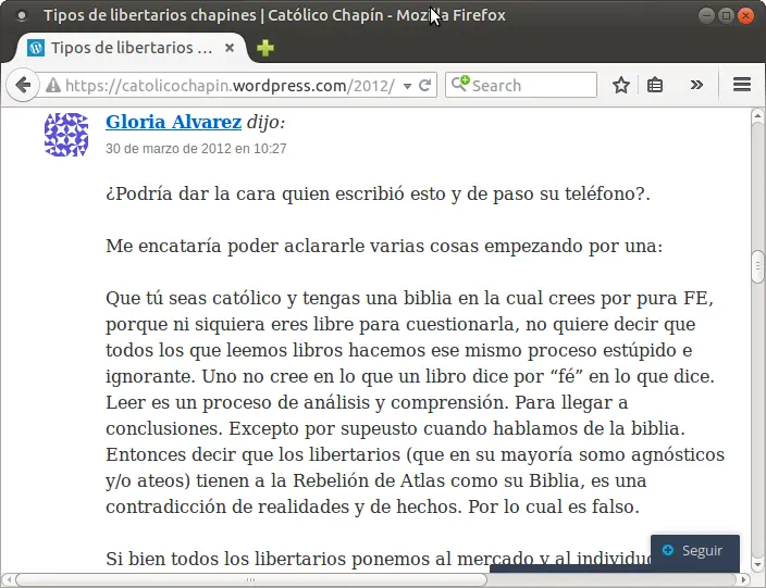 A partir de este post y de varios comentarios en posts de política mencionando a Gloria Álvarez, me entró la curiosidad de saber quién es esta persona, así que procedí a googlear. Lo que llamó mi intención es ver que está señorita es guatemalteca. En ese momento supe que algo no cuadraba. Resulta que hace varios años me interesé por conocer un poco más acerca de los llamados libertarios y su pensamiento. Es así como descubrí a personajes como Ayn Rand, que es a los libertarios lo mismo que Putin a los taringueros, Ron Paul y otros. También me enteré acerca de la escuela austríaca, de Somalia, de la trama de Bioshock y demás; quienes hayan tenido la misma curiosidad sabrán de qué hablo. El hecho es que con el pasar de mis busquedas, descubrí que a los libertarios pocos los toman en serio. Tanto gente de derecha como de izquierda los considera casi unos niños caprichosos (cabe mencionar que su ideología tiene uno que otro punto interesante). Es así como llegué a una entrada de un blog guatemalteco donde el autor se burlaba de los libertarios, pueden verlo aquí. Lo interesante es que uno de los comentarios era de lo más colérico, es decir alguien se tomó en serio una entrada que de seria no tenía nada, confirmando así la imagen que muchos tienen de los libertarios. A estas alturas ya sabrán de quien fue ese comentario. Veanlo completo aquí Yendo al grano, después de ver su video en el que habla del Populismo y la República, y a partir del sesgo ideológico que tiene, llego a la conclusión de que esta persona MIENTE. Habla de que la discusión en América Latina dejo de ser entre la Derecha y la Izquierda y que ahora se trata del Populismo frente a la República, pero eso no es así. Ese es el empaque en el que lo vende, en el fondo su discurso promueve el Individualismo en desmerito del Colectivismo, el libre mercado en perjuicio del Estado, una sociedad de consumidores frente a una sociedad de ciudadanos. A todo esto, el problema no es que tenga sus ideas y las divulgue, el problema es que engaña al público y no dice el verdadero propósito de las mismas. FIN
