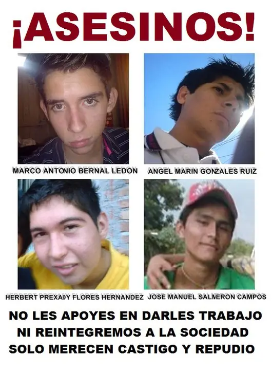 HOLA T! HOY LES TRAIGO LA HISTORIA DE ESTE POBRE PERRO primero les pongo la imagen de los hijos de puta que lo hicieron sufrir son de mexico nayarit es una desonra para mi pais Historia hecha por un periodico del cual desconosco el nombre Callejerito, es el perro que fue torturado y asesinado a golpes y palos por cuatro jóvenes en Nayarit, quienes lo grabaron y lo subieron a Facebook. Algunos dicen que su nombre era "Bucho", pero en realidad, el cachorro vivía en las calles. Hoy, su imagen exige justicia en la misma red social a la que los asesinos enviaron las imágenes, que ya han sido criticadas en redes sociales y por asociaciones protectoras de animales. Según la organización ProviDigna, los agresores del canino tendrán que pagar sólo 381.29 pesos de multa por el crimen de "Callejerito" como ya lo nombran en Facebook, donde le crearon un grupo. Reacciones de verdadera cólera y rabia son las que ha desatado el caso. Incluso, hay quien ya paga por agredir a los jóvenes Marco Antonio Bernal Ledón, Herber Prexady Flores Hernández y Ángel Marín González. Rabia en redes "Por los qe odiamos a MARCO ANTONIO LEDON BERNAL!!! ahora sii, les salio lo marica a los weyes,, no que muy hombres pues?..(sic)", es el grupo creado en Facebook por casi cinco mil personas en contra de Marco Antonio Bernal Ledón, Herber Prexady Flores Hernández y Ángel Marín González, a quienes llaman en Internet como los "mataperros". #JusticiaEnNayarit, #NoAlMaltratoAnimal y #LOSASESINOSDPERRITO son las etiquetas que se manejan en Twitter, en donde se pide castigo por los actos de los jóvenes. Marco Antonio Bernal Ledón, Herber Prexady Flores Hernández y Ángel Marín González, en entrevista con la estación local Radio Capital 980 se dijeron arrepentidos, pero admiten que asesinaron y torturaron al perro, pues quería atacarlos. En la descripción que él mismo hizo de su captura, señala que fue por unos amigos para meter al perro en un costal, para llevarlo al domicilio donde fue asesinado. El animal fue atacado por dos perros pitbull, quienes lo mordieron en el cuello, y cuando se trataba de incorporar, era agredido por un muchacho, que lo tomaba de las piernas traseras y lo estrellaba contra el piso y árboles. "Estamos chavos" Finalmente, cuando el perro se encontraba malherido, el joven le dio dos palazos en la garganta, los cuales dejaron el cuerpo sin vida. Marco Antonio Bernal Ledón aseguró que el perro quería morderlo y que regresó a matar al animal, aunque insistió en que antes trató de comunicarse con la perrera municipal. "El video habla por sí solo, la forma en que lo hicimos, la forma en que festinamos el video", dijo Bernal Ledón. "Por suerte no me atacó porque iba directo al cuello", agregó. El joven señaló que subió el video a su Facebook porque quería conocer el punto de vista de otras personas. Otro de los jóvenes confesó que "como podrán ver todo esto fue grabado con mi celular", pero Marco Antonio Bernal Ledón dijo que "fuimos por este joven para que lo grabara y tontamente se involucró involuntariamente". Además, el mismo Bernal Ledón dijo que él lo subió a Facebook -tras un año de la muerte del perro-, "pero no pensé que fuera tan grande" y desconoce quién lo subió a YouTube. Ángel Marín González se excusó diciendo que "estamos chavos", y mencionó que uno de los perros que utilizó para torturar fue envenenado, y el otro lo regaló porque temía por su vida. Por otra parte, durante la entrevista se abordó el tema del endurecimiento de las leyes contra el maltrato animal. El video de los "mataperros" Los jóvenes son vendedores de lámparas y estudian en el Colegio Nacional de Educación Profesional Técnica (CONALEP) de Tepic, de donde las autoridades escolares los suspendieron tres días. por si fuera poco aqui esta el video link: http://www.youtube.com/watch?v=hVndq0xFtt4 el video de como lo mataron: agan clic en el http://www.dogguie.com/salvajes-adolescentes-torturan-brutalmente-a-un-perro-hasta-matarlo/ espero que dios los perodne por que nadie mas lo hara