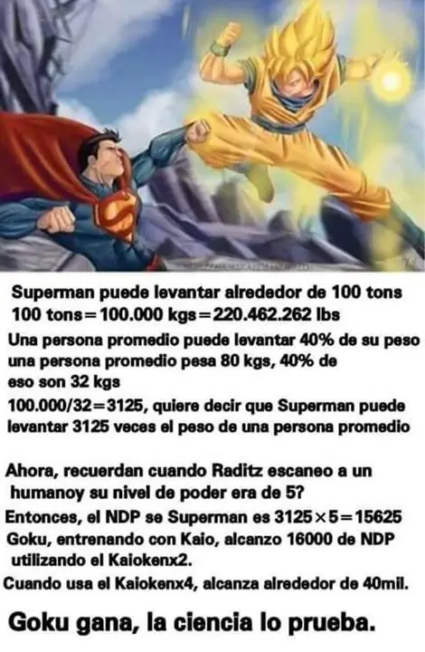 Hola tarinvirgos, vi en un shout que pusieron unos supuestos ki de superman y goku. bueno la verdad estoy medio al pedo y me puse a investigar, miren.: este es el verdadero ki de superman : 1.406.250.000.000.000 vegetossj1: 4.300.000.000.000.000 vegitossj2: 175.000.000.000.000.000 vegitossj3:800.000.000.000.000.000 lo calcule con esto: En Superman #13 (New 52), Kal-El fue mostrado levantando 6000 trillones de toneladas. Tan exorbitante cifra pertenece a la masa de la Tierra. En dicho cómic, Superman se vio obligado a levantar este peso durante 5 días. Tal resistencia, delata una fuerza aún mayor al peso levantado; estimemos al menos un 50% más (quizás quedando cortos), lo cual nos daría aproximadamente 9000 trillones de toneladas. Obviamente, existen tantas versiones como escritores. Los relatos de las eras de Oro y Plata son tan fantásticos, que sería ridículo calcularlos. Es más, en cierto número se dice que Superman es capaz de levantar EL infinito; cosa que no nos sirve a fin de calcular un estimado de su fuerza. Publicidad Cifra final: 9000 trillones de toneladas. conclucion... solo con vegito en ssj1 es mas q suficiente para romperle la cola a superman , salu2