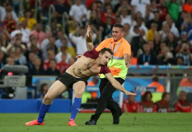 Muchos pensaron que se trataba de un personaje ajeno al fútbol, de esos que les gusta robar cámaras por algunos segundos en eventos importantes, como en este caso, la final del Mundial Brasil 2014, entre Alemania y Argentina. Pero no. El ‘espontáneo’ ya es un experimentado en estas lides. Es un comediante ruso conocido como Vitaly Zdorovetskiy acostumbrado a realizar bromas de todo tipo y que cuenta con su propio canal de Youtube, así como su página de Facebook y Twitter. El ruso ingresó al campo de juego al promediar el minuto 37 del segundo tiempo. Entró por detrás de las bancas y en la cancha se quitó el short y se levantó la camiseta para correr hacia la posición de Benedickt Hoewedes a quien quiso saludar con un beso para luego correr ante la persecución de los elementos de seguridad que intentaban detenerlo. En el pecho llevaba un mensaje “Natural born prankster” (Bromista nacido naturalmente). La salida del ‘bromista’ fue por demás algo accidentada y terminó encerrado en una prisión de Río de Janeiro. El video del momento, que no fue mostrado por las estrictas reglas de la FIFA fue captado por la estrella de la NBA LeBron James. DAME UN BESITO PAPI!! VIDEO DEL CANAL OFICIAL!! COMENTEN!!