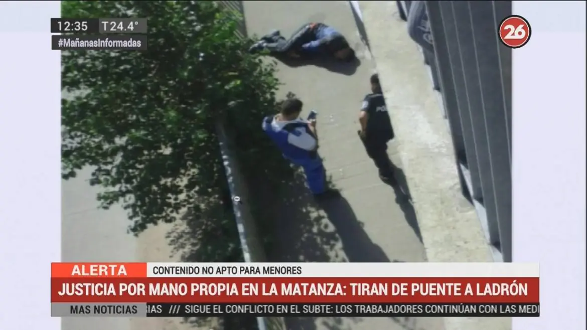 En las cercanías del velorio de Leandro Alcaraz, el chofer asesinado en Virrey del Pino, un delincuente fue arrojado desde un puente En medio del velatorio de Leandro Alcaraz, el colectivero asesinado en Virrey del Pino, se dio un hecho de justicia por mano propia que abre un nuevo debate en la sociedad. Un delincuente fue tirado desde un puente luego de intentar asaltar a una joven. Tres hombres lo arrojaron cuando vieron el violento hecho. El hecho se produjo muy cerca del último adiós a un trabajador que fue asesinado por dos delincuentes en medio de una Argentina que se desangra por la inseguridad y la violencia.