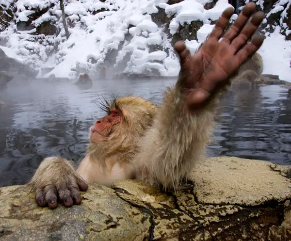 6- El Mono de la Nieve: vive en el bosque helado de Japón, un lugar muy difícil de sobrevivir, en grupos buscan aguas termales para calentarse en este lugar tan frió. Algunos no pueden entrar y mueren porque estos monos han desarrollado hasta clases sosciales.