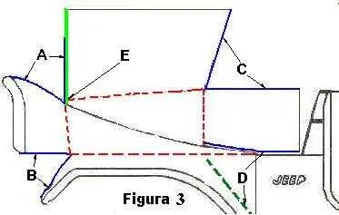 Ahora deberemos proceder a unir la parrilla que hemos armado con la pieza 1 que habíamos plegado anteriormente. Deberemos tener sumo cuidado con esta operación ya que si queda desplazada la unión de la parrilla con la carrocería nuestro jeep quedará con el frente inclinado hacia un costado y se nos complicará enormemente el ajuste cuando confeccionemos el capot. La parrilla se pega a la carrocería uniendo los puntos E de la figura 3 y E de la figura 4 y la línea de color verde dibujada en la figura 3 y 4. Estas líneas de color verde nos darán la curva que posee en ese sector el panel interior del guardabarros que habíamos mencionado anteriormente.