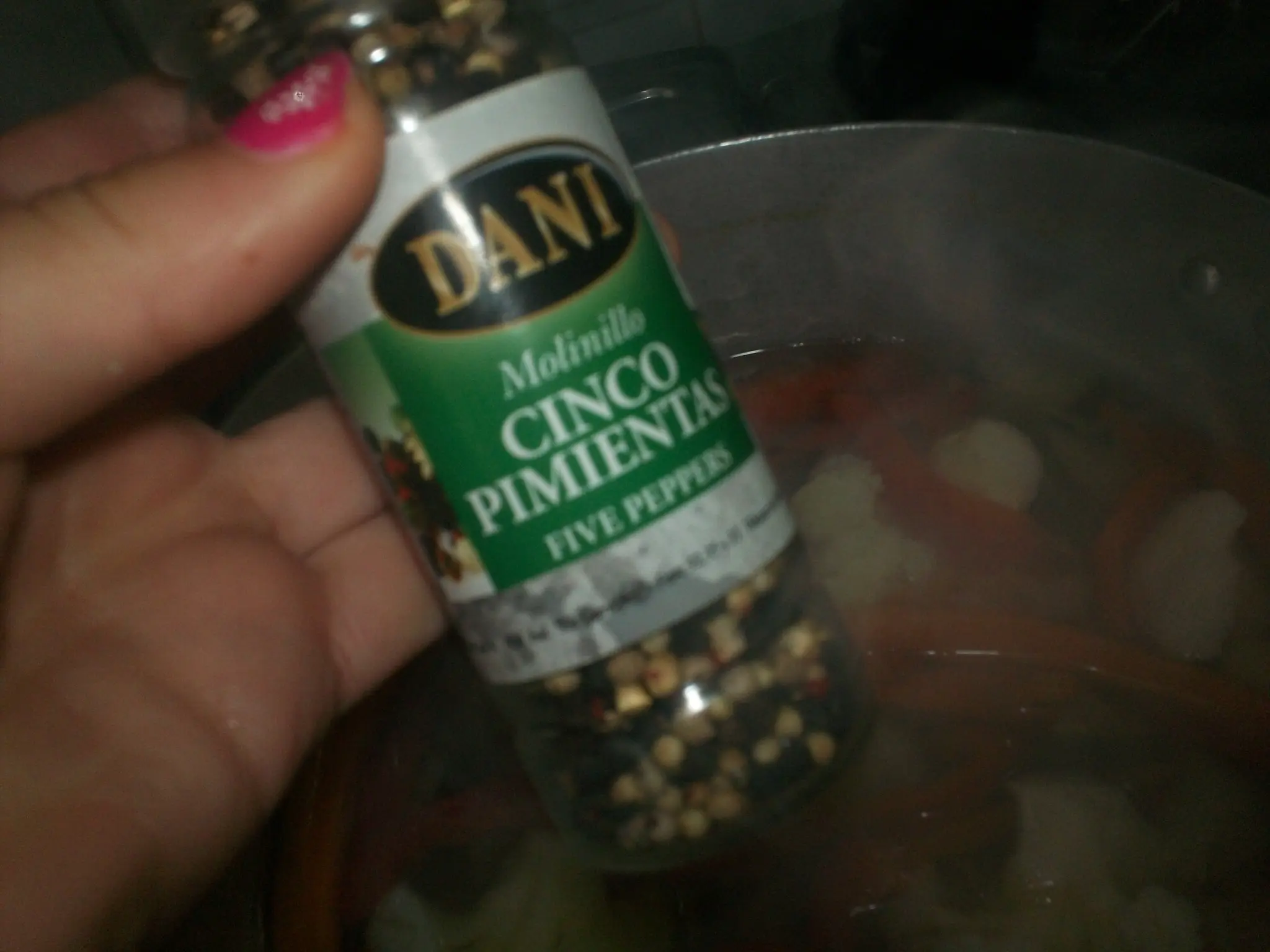 cuando hierve sacamos del fuego y ponemos pimienta yo use pimienta en grano de 5 tipos diferentes de pimienta,