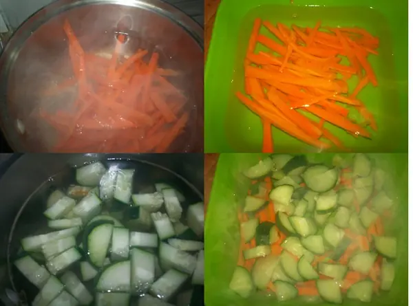 yo primero puse las zanahorias 5 minutos solamente lo mismo con cada verdura. luego la aparte a un bowl con agua fria. a medida que se calienta el agua de el bowl irla cambiando y poner agua fria nuevamente.