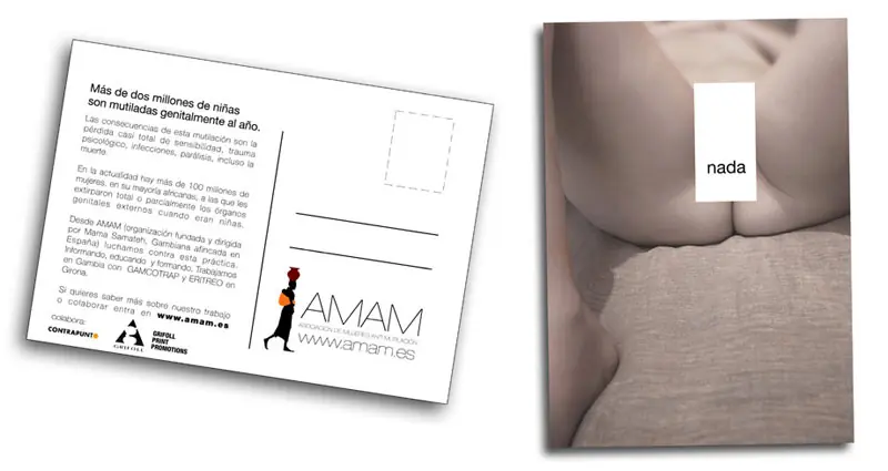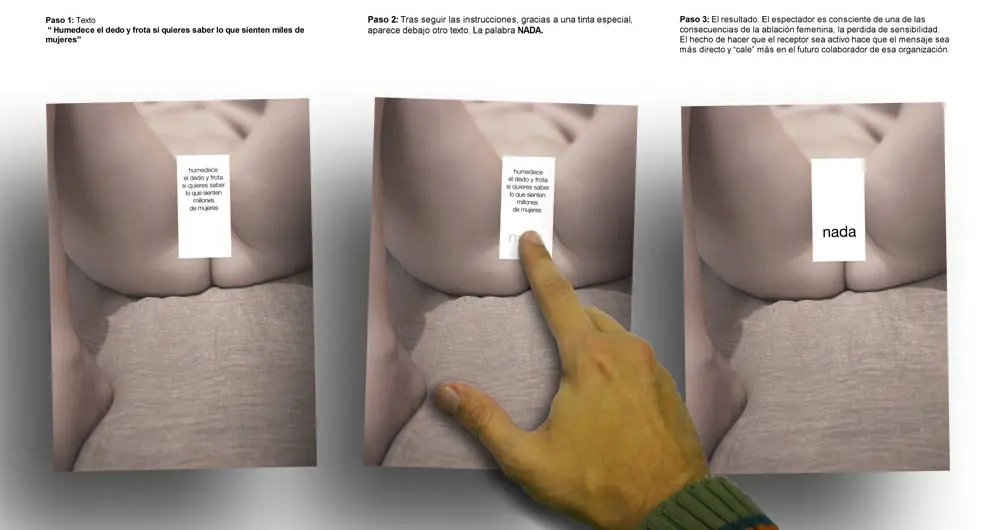 Esta asociación ubicada España realiza a lo largo del año varias campañas impactantes y a veces crudas para contrarrestar el problema. En esta ocasión su trabajo junto a Contrapunto BBDO inclinó su mensaje hacia las mujeres colocando este BTL en piezas de lencería y trajes de baño unos adhesivos en forma de pantiprotectores con el copy "más de dos millones de niñas son mutiladas genitalmente al año"