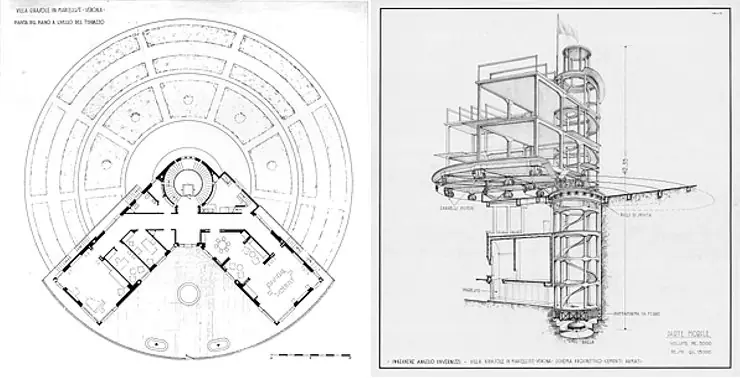 Construir edificios móviles o con plantas dinámicas es algo que comienza a extenderse, al menos en proyectos de vanguardia arquitectónica, pero en realidad no se trata de nada nuevo. He aquí un sorprendente ejemplo de ello, se trata de Villa Girasole, edificio levantado en las cercanías de Verona, en Italia. Se construyó entre 1929 y 1935, bajo las indicaciones y diseño del ingeniero Angelo Invernizzi que deseaba traer al mundo real una estructura capaz de seguir el movimiento del sol. A una velocidad de cuatro milímetros por segundo, quince conjuntos de ruedas sobre base circular, animados por propulsión diésel, hacen que la Villa pueda realizar una rotación completa en nueve horas y veinte minutos.