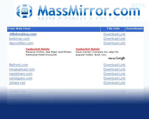Como FTP2Share, MassMirror también te deja subir archivos y distribuirlo entre diversos almacenes gratuítos, es bastante mas comodo que la anterior, ya que no es necesario registro, el límite por archivo es de 1000MB, también permite añadir archivos desde URL y mediante subida por web a su host, y puede distribuir el archivo subido entre 8 almacenes gratuítos: 4filehosting, badongo, depositfiles, filefront, megaupload, rapidshare, sendspace y zshare.net.