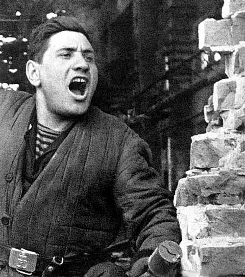 Pavlov levantó lentamente su metralleta y apuntó, con el dedo un poco crispado en el gatillo. De repente, uno de los alemanes lanzó un grito y todos se incorporaron y saltaron hacia delante. Entonces, Pavlov vociferó: "¡Fuego!", y las cuatro metralletas escupieron sus ráfagas sobre los alemanes. Seis de ellos cayeron fulminados y los otros volvieron a tenderse vacilantes. ¿Qué iban a hacer?¿Avanzar o batirse en retirada? Pavlov esperaba, dispuesto a disparar de nuevo. Uno de los alemanes se incorporó a medias, apoyándose sobre una rodilla, y se desplomó en seguida bajo las balas rusas. Esto bastó a los que quedaban, que dieron media vuelta y se largaron, arrastrándose.