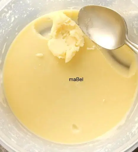 Sacas del fuego, esperas un minuto para que pierda un poco de calor y le incorporas 30 gr de margarina para cocinar, crisco o vegetalina, lo que tengas en casa. Revuelves hasta que se derrita