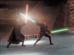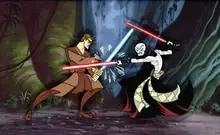 Anakin, haciendo uso de la Fuerza, saltó interponiéndose en el camino del sable láser de Dooku, bloqueándolo con el suyo, salvando noblemente la vida de su Maestro. Entonces, Anakin usó el sable de su Maestro junto con el suyo en el duelo contra Dooku. El sable extra le dio a Anakin una ventaja táctica, aunque fue, no obstante, breve. Primeramente, Dooku consiguió destruir uno de los dos sables láser, dejando a Anakin solo con uno, asi, Anakin cambio a su forma de combate favorita, pero después de un intenso duelo, Dooku de improviso, cortó el antebrazo derecho de Anakin con su sable luz, terminando así el duelo. Después de ser rescatados por Yoda, el antebrazo de Anakin fue reemplazado poco después por una prótesis mecánica.