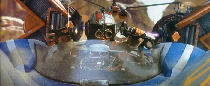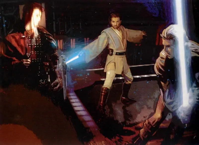 Anakin y Obi-Wan perseguían al Conde Dooku, el cerebro de la Confederación y, desconocido para ellos, un Lord Sith. Lo persiguieron a través de los vastos campos de arena de Geonosis, hasta que fueron llevados por él hacía un hangar propiedad de la Confederación. Una vez lo hubieron alcanzado, Anakin, en vez de seguir el sabio consejo de su Maestro, tontamente se apresuró impetuosamente a atacar a Dooku con una terca actitud. Fue la ruina para el padawan: Dooku descargó un poderosísimo aluvión de Relámpagos de la Fuerza sobre Anakin, dejando al joven inconsciente y quedándose su Maestro a solas con Dooku. Obi-Wan plantó cara valientemente, sin embargo, sus habilidades probaron no estar a la altura del poder y la experiencia de Dooku, y fue rápidamente vencido. Mientras Anakin se había recobrado de los Relámpagos de la Fuerza y fue testigo de cómo Dooku alzaba su sable luz para dar el último golpe al caído Obi-Wan.